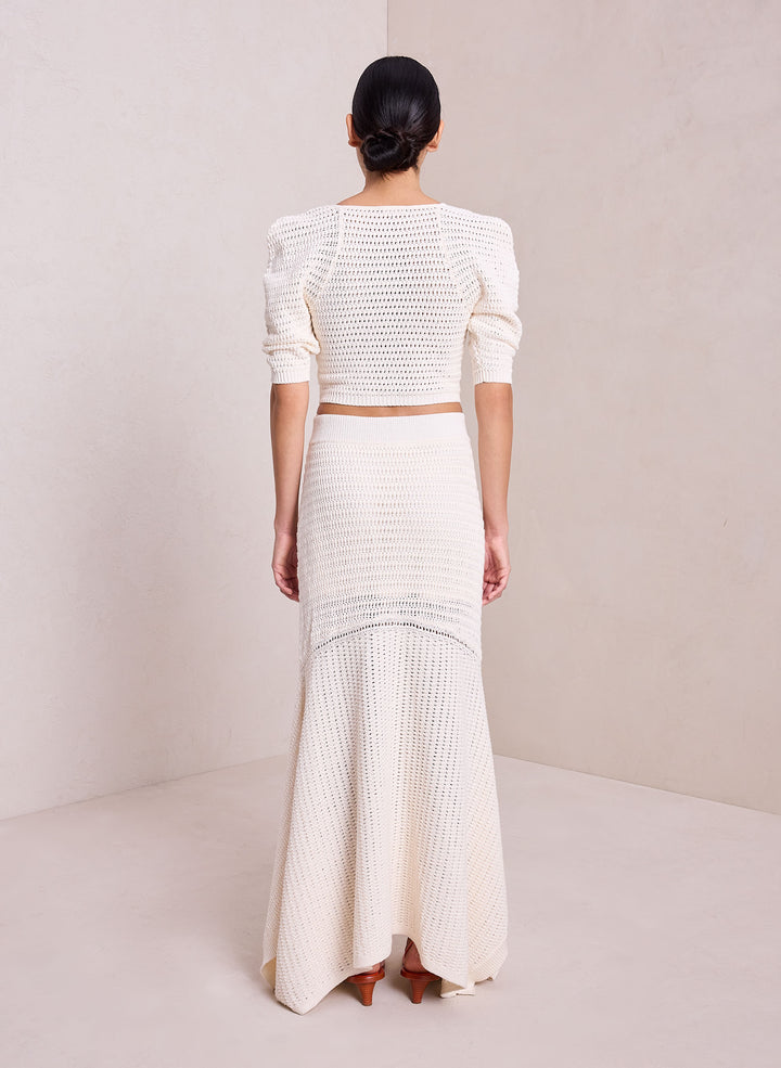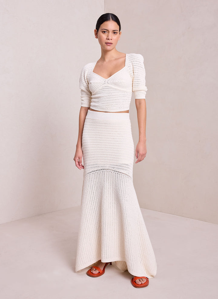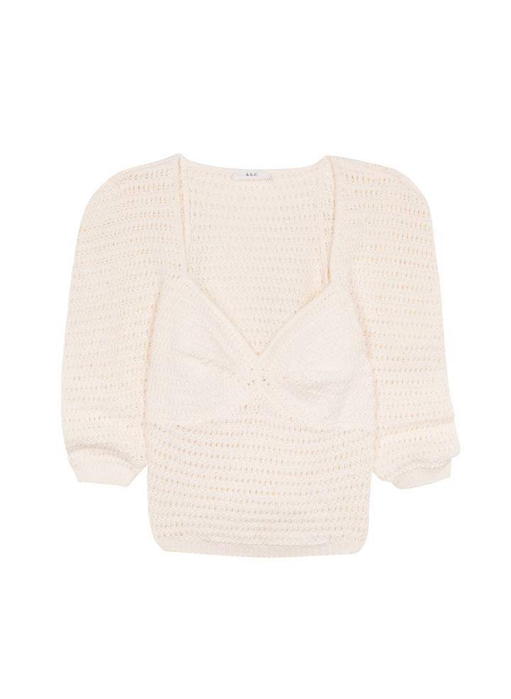 DescriptionThe Gigi Top is crafted from a soft twist cotton fabric in a creamy oat shade. This feminine silhouette is intricately knitted with a warm-weather feel, featuring a sweetheart neckline, bustier-inspired detailing, and puff sleeves. Shop Tops