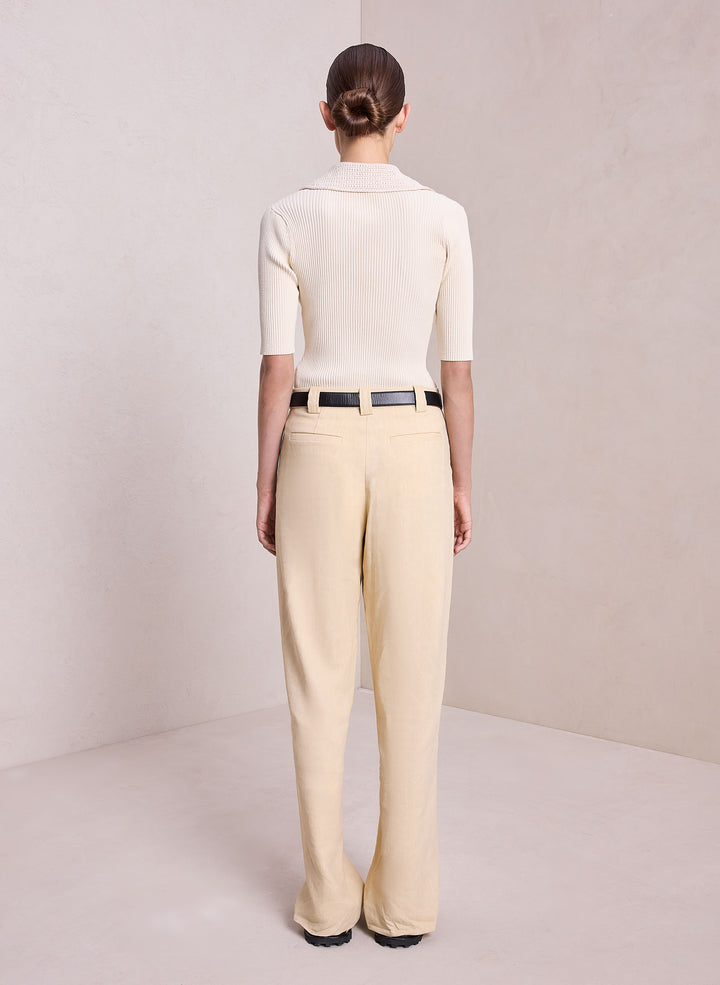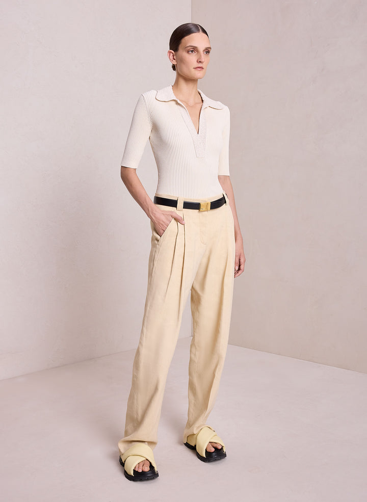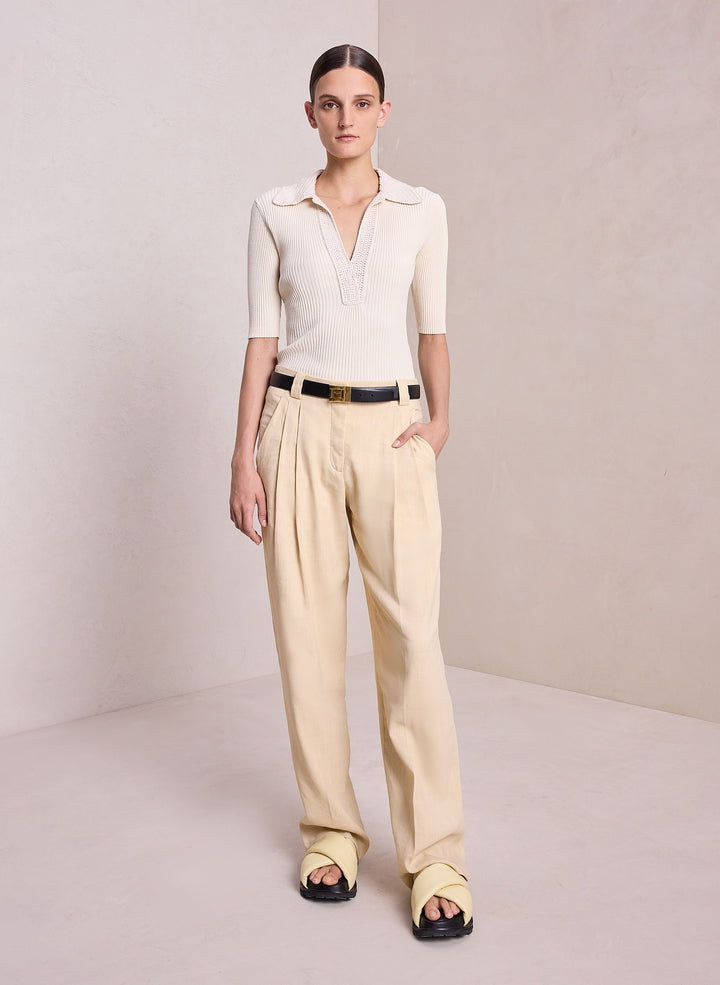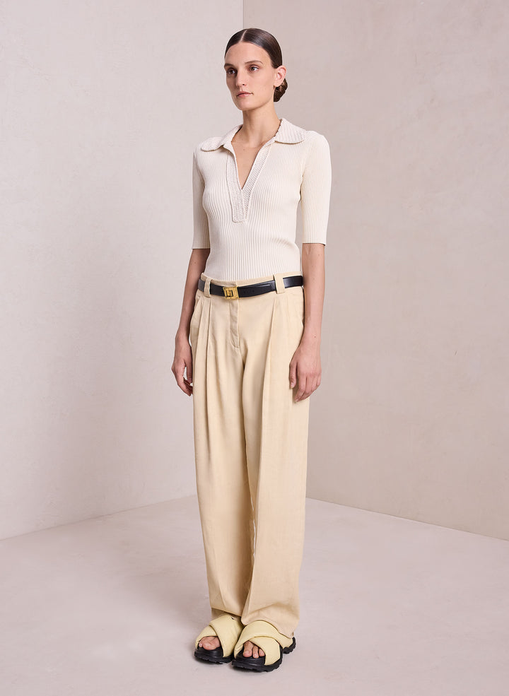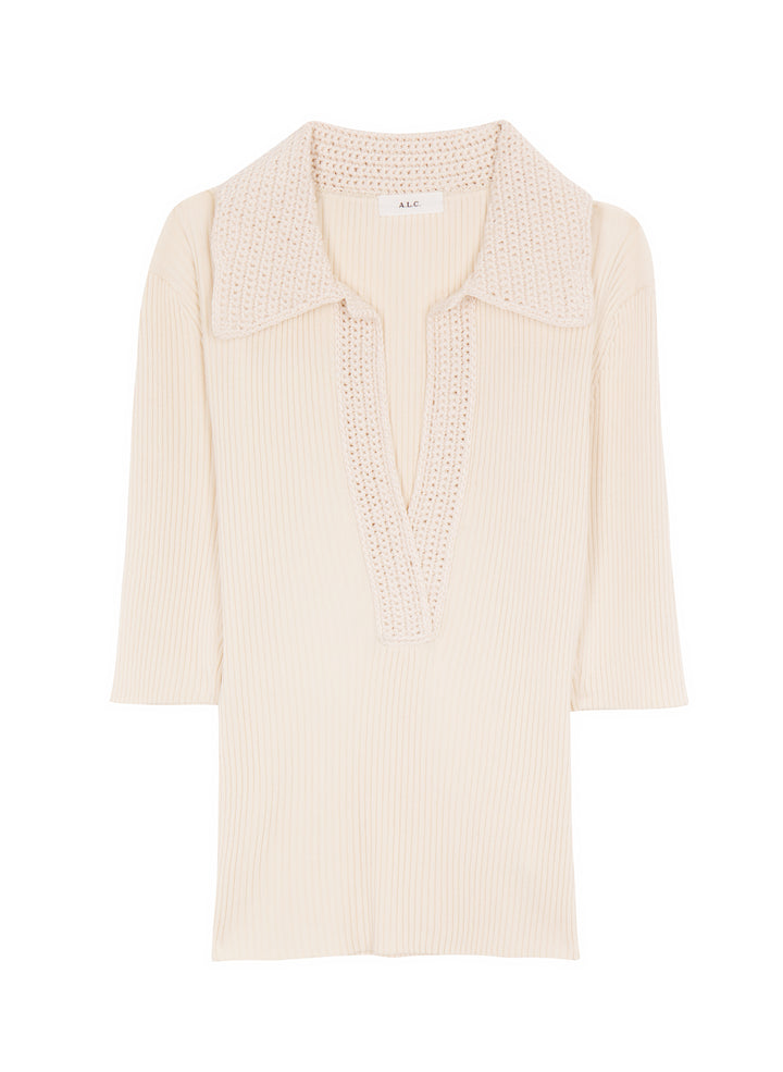 DescriptionThe Adrian Top is crafted from a dry viscose blend fabric in a creamy oat shade. This fitted silhouette is ribbed, featuring an intricately crocheted polo collar neckline with a warm-weather feel. Shop Tops
