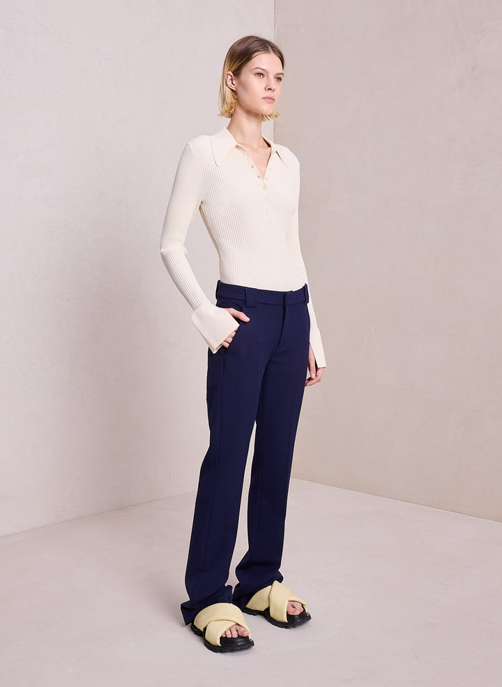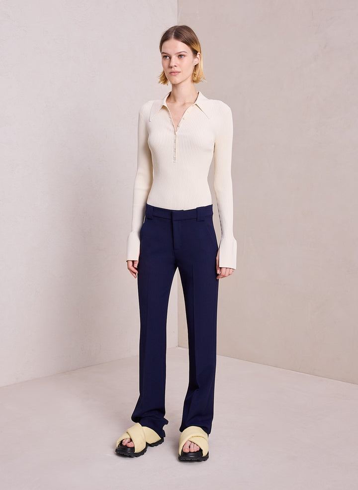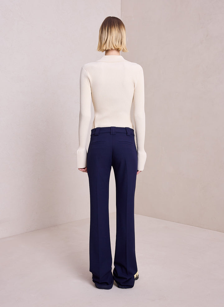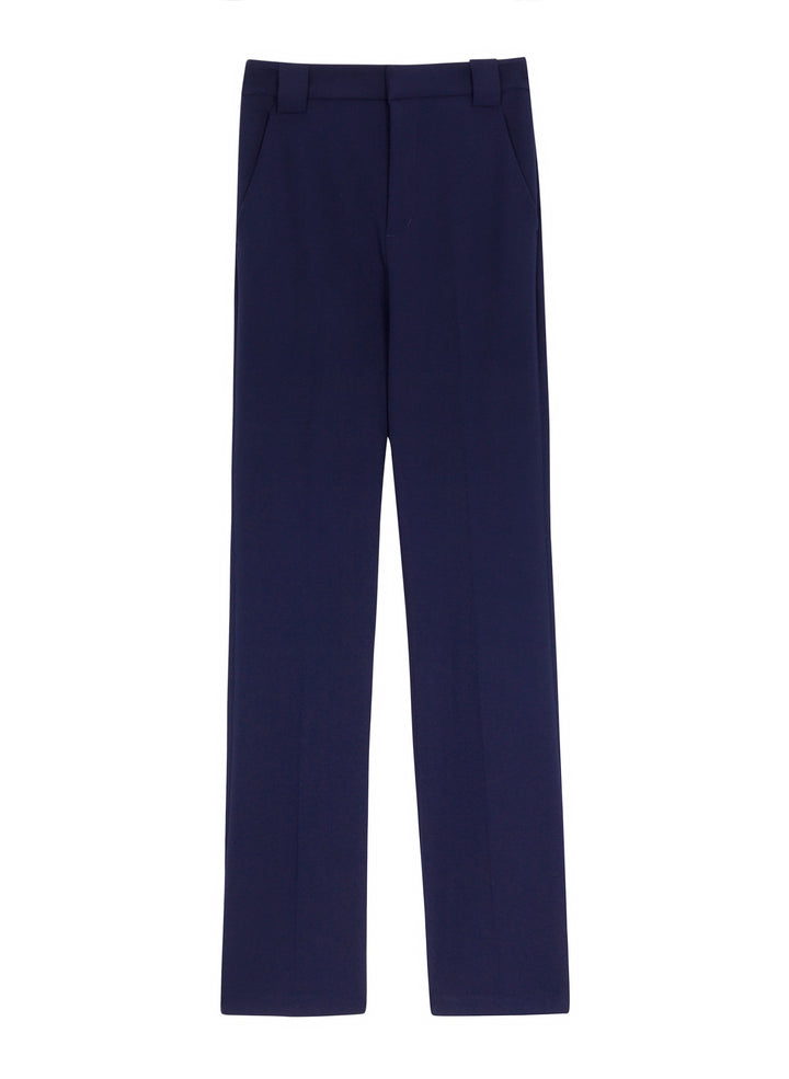 DescriptionThe Sophie Pant is crafted from our refined suiting fabric in timeless French navy. This straight-leg silhouette features a mid-rise waist with a subtle kick out from the knee that subtly pools at the hem. This jacket fits true to size. Shop Bottoms