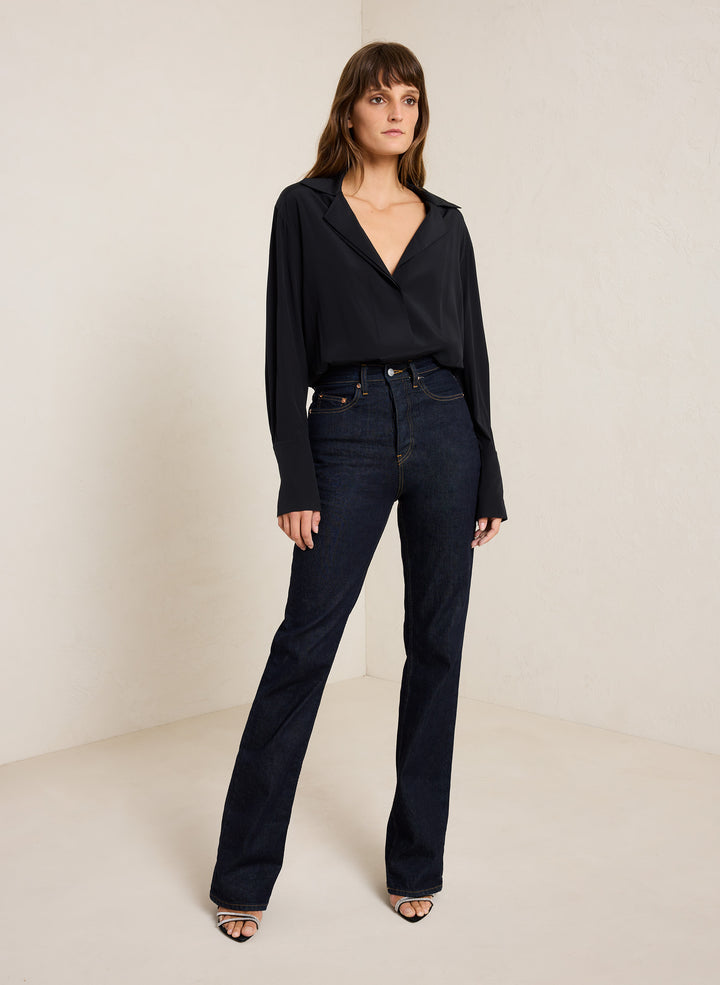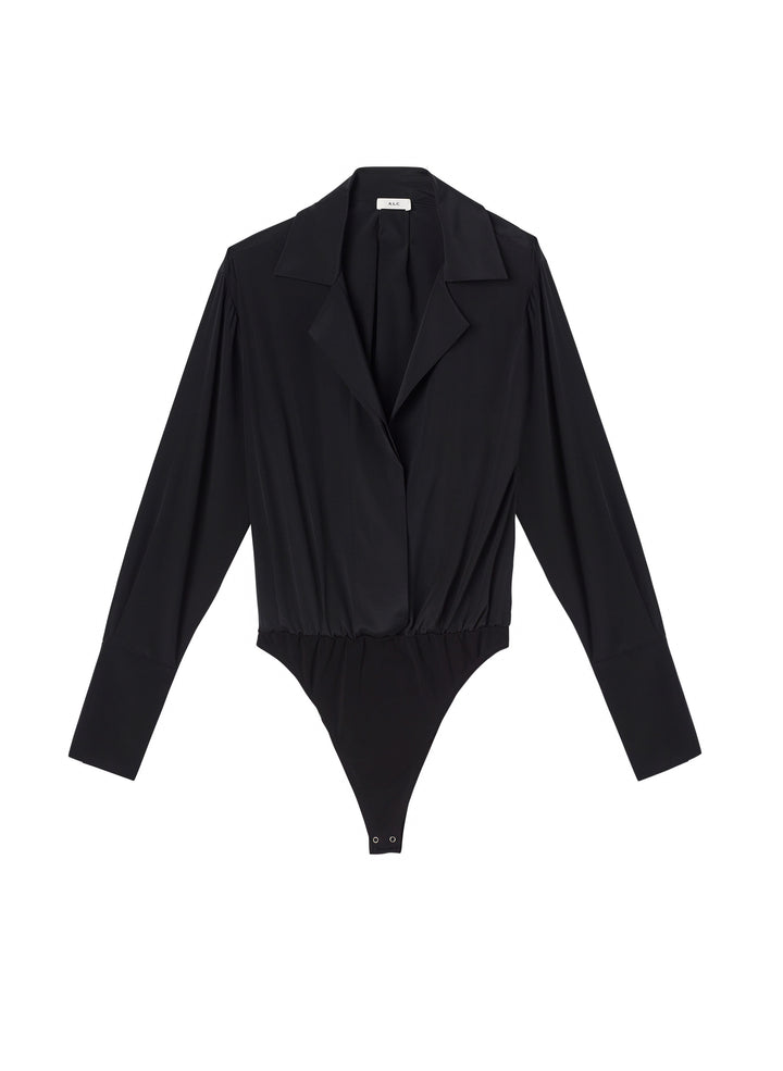 DescriptionThe Diana Bodysuit Top is crafted from our lustrous stretch silk fabric in classic black. This fluid silhouette features a built-in cami with a pointed notch collar and long sleeves with extended cuffs. Shop Tops