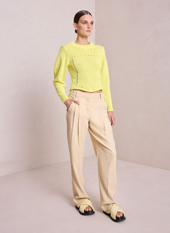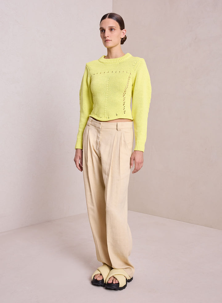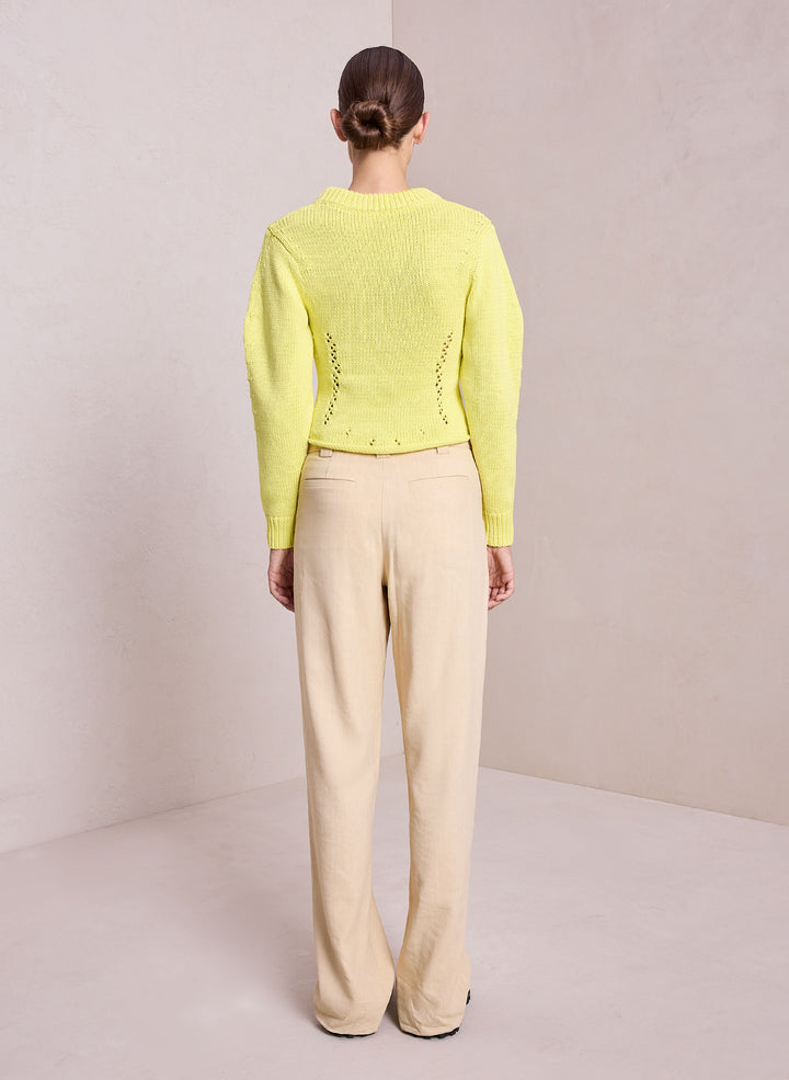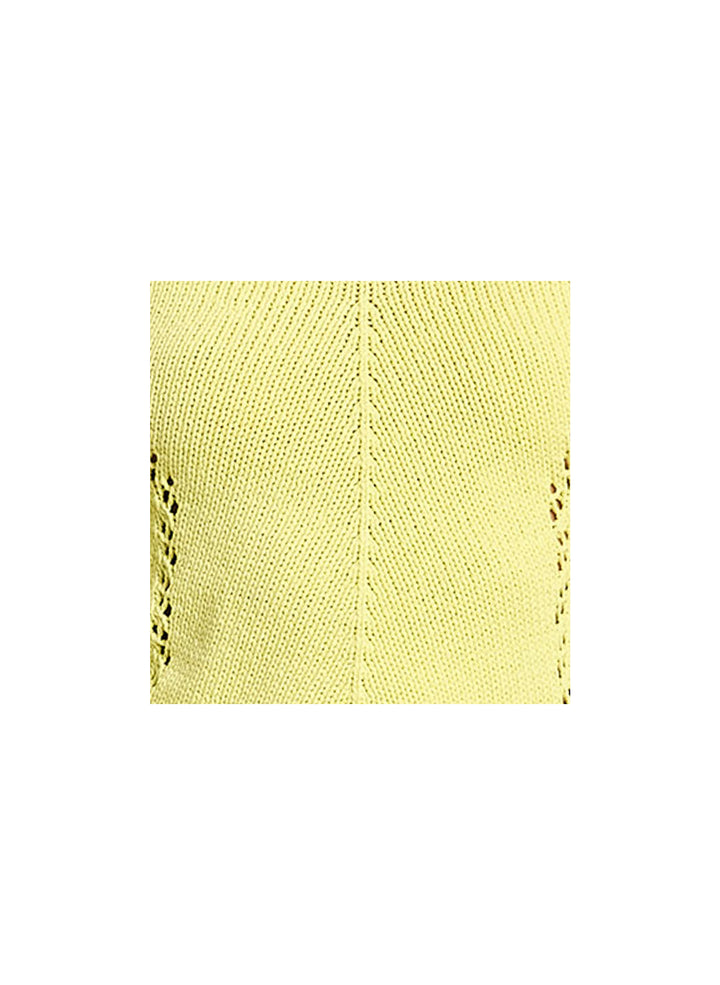 DescriptionThe Jodie Sweater is crafted from a cotton pointelle fabric in sunny citrine. This feminine silhouette is intricately knitted with a warm-weather feel, featuring a round neckline, crochet detailing, and long puff sleeves. Shop Sweaters