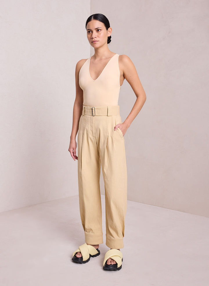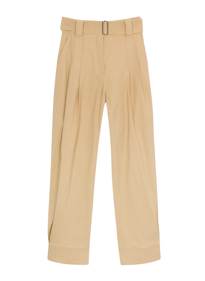 DescriptionThe Darcy Pant is crafted from a linen viscose blend fabric in a sandy beige hue. This cropped silhouette takes inspiration from safari style, featuring darted pleats, a belted waist, and tapered legs. Shop Bottoms