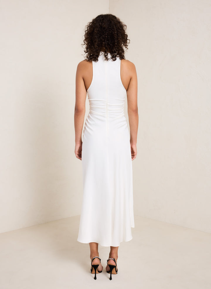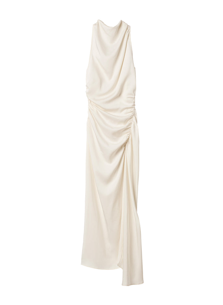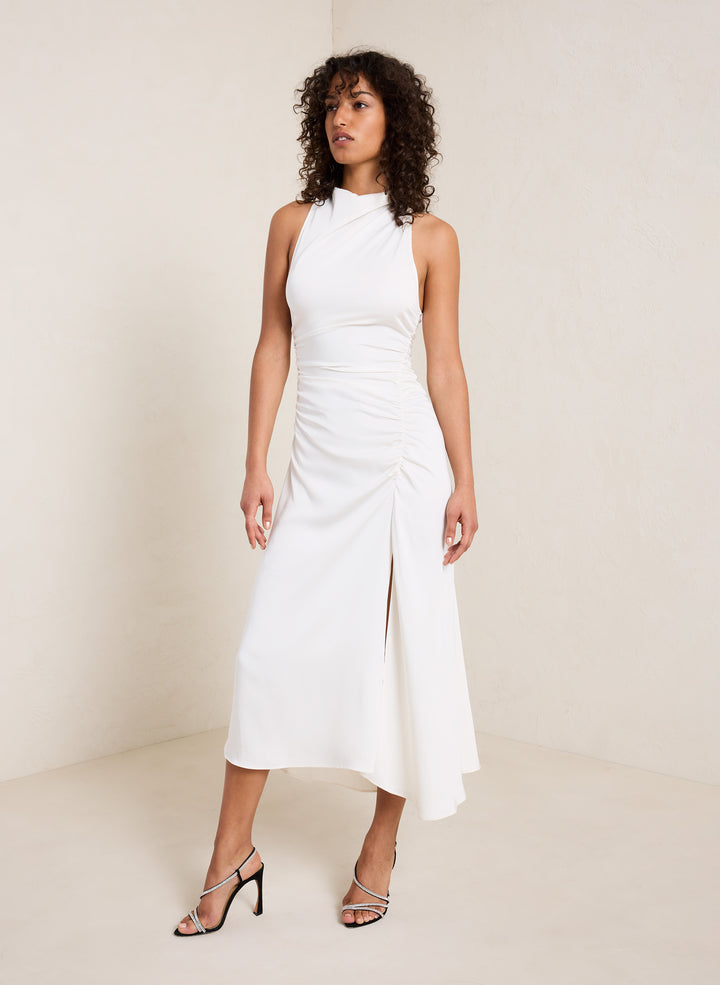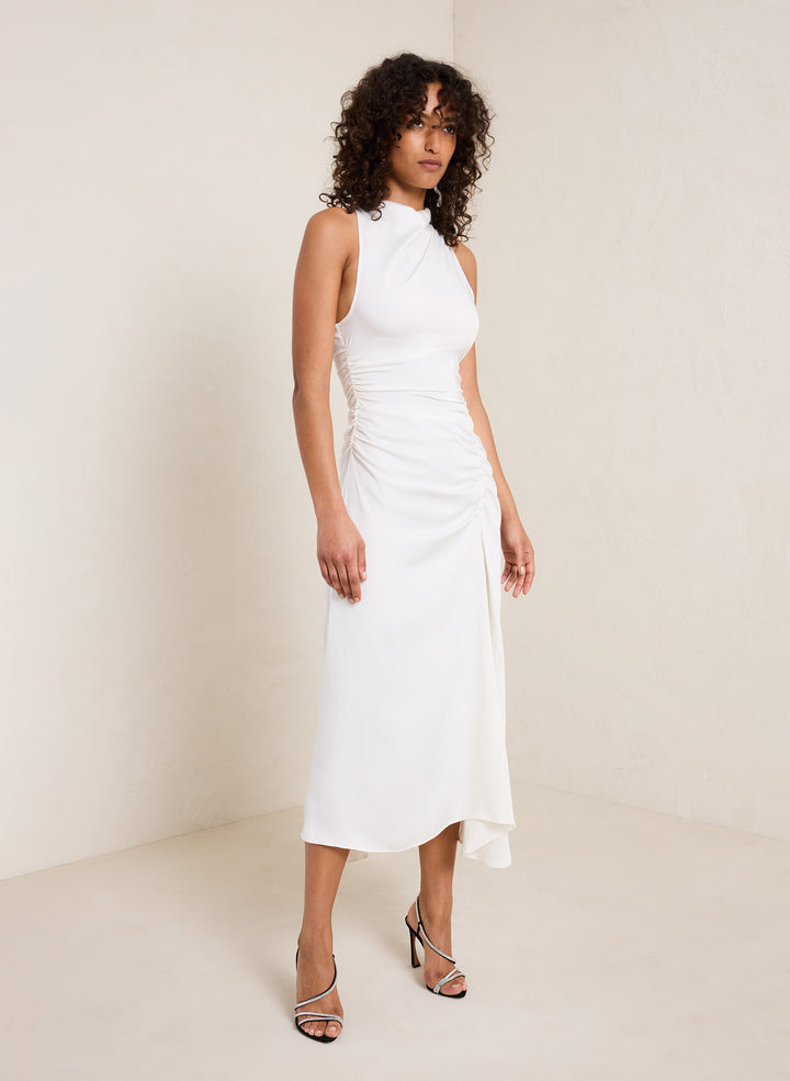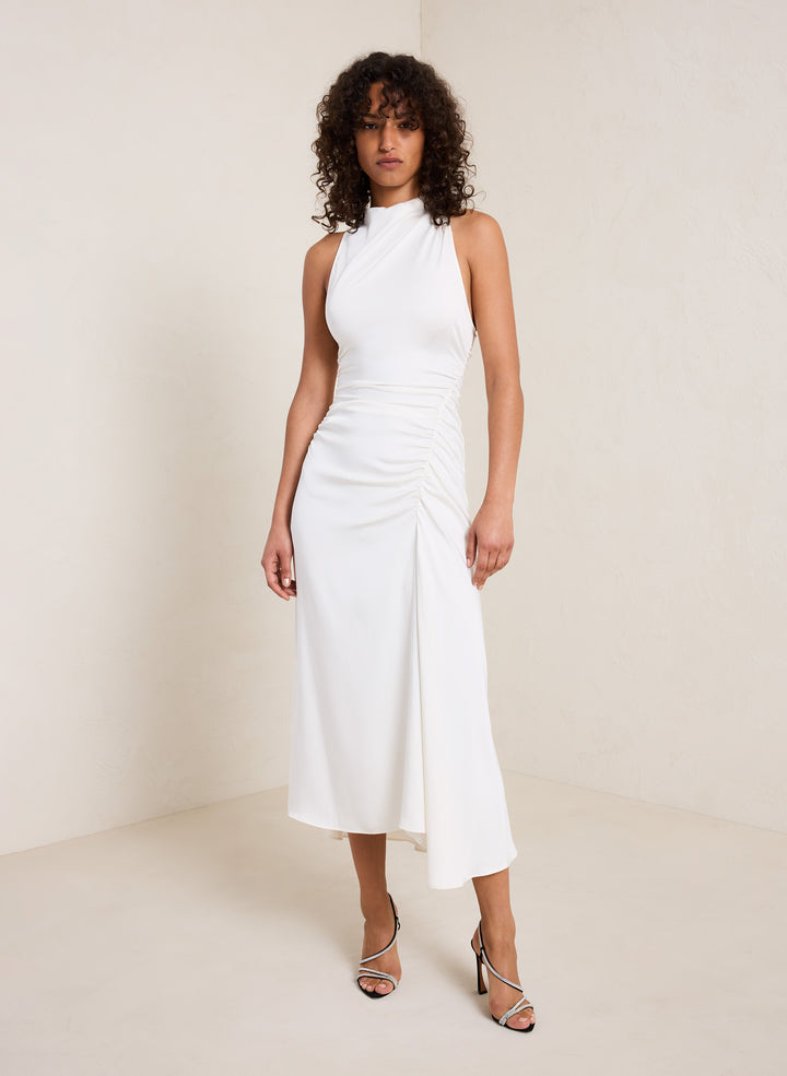 DescriptionPart of our Holiday Evening Capsule 2022 collection, the Inez Dress is crafted from our textured satin in a lustrous winter white hue. This body-skimming midi silhouette features a delicately draped mock neck and ruched detailing. Shop Dresses