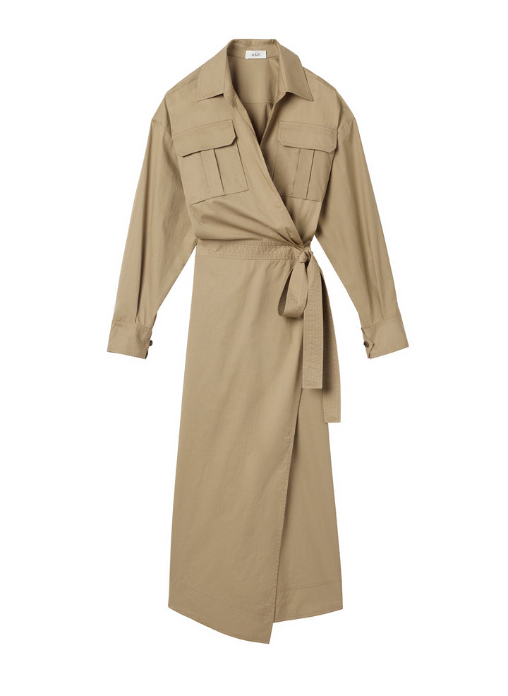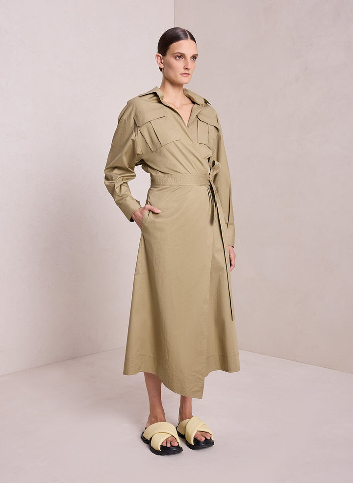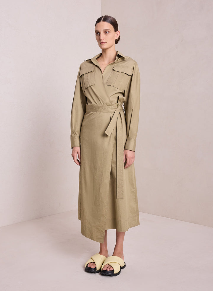 DescriptionThe Clarissa Dress is crafted from our crisp, airy day cotton in an earthy moss green. This flattering modern midi reimagines the classic wrap dress with safari-inspired detailing, including box pleat flap pockets, a single buttoned back vent, and a self-tie belt. Shop Dresses