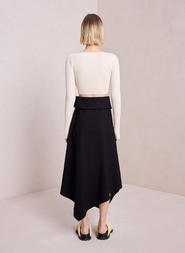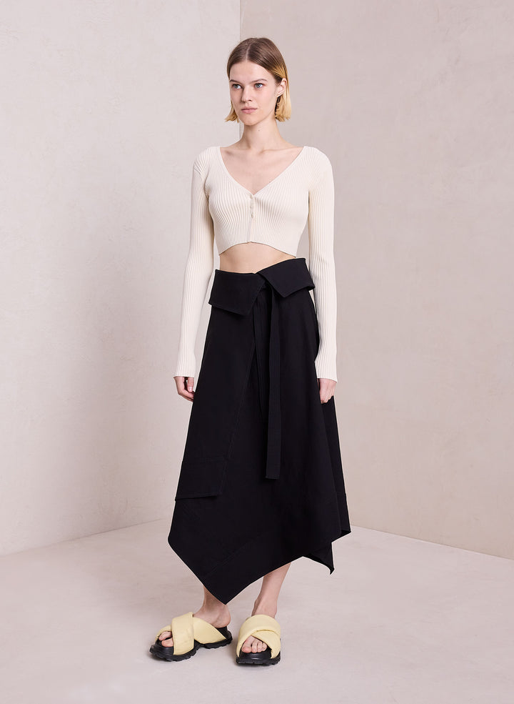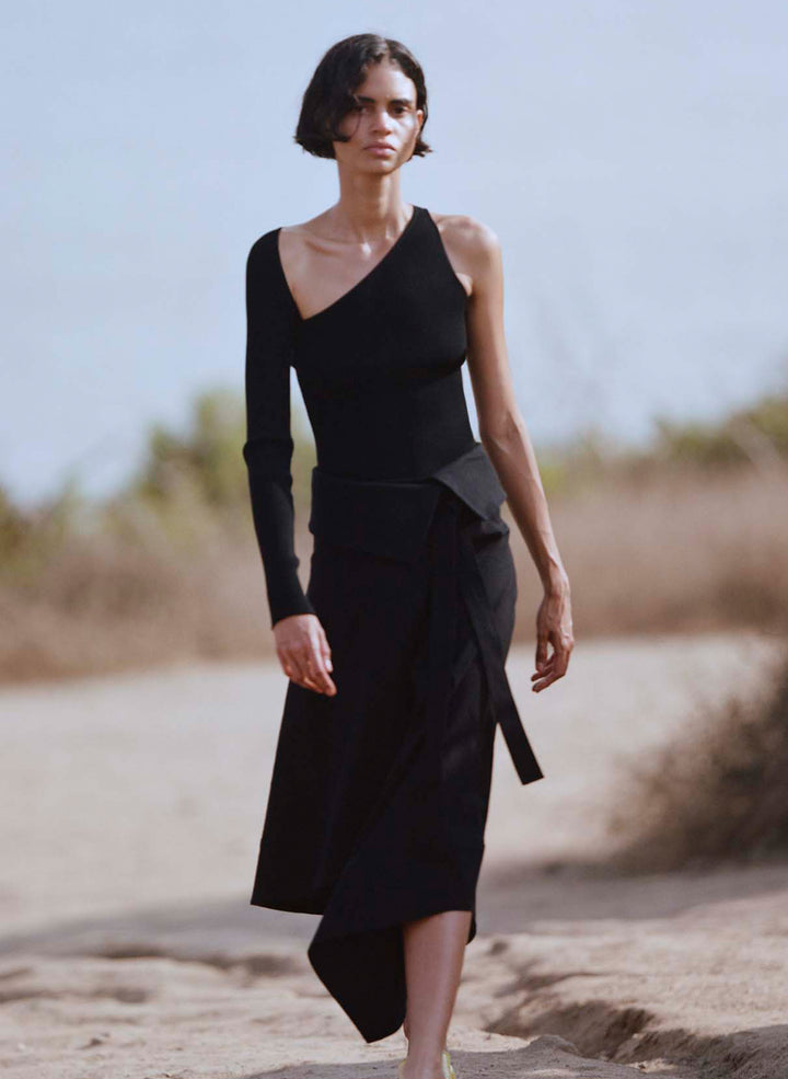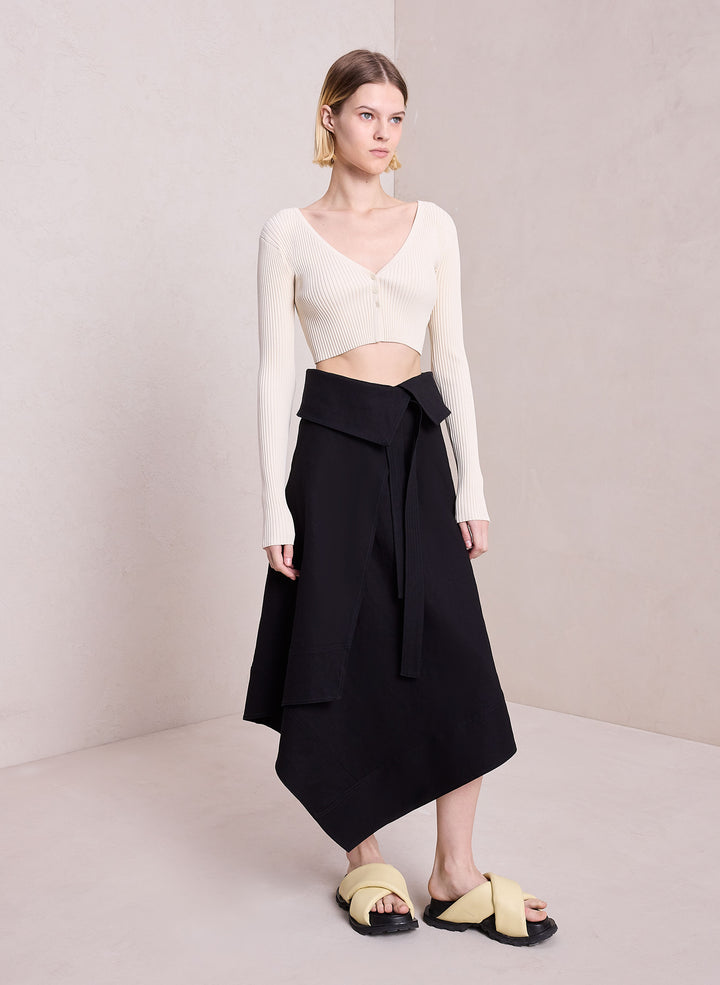 DescriptionThe Mackenzie Skirt is crafted from a linen viscose blend in versatile black. This minimal silhouette takes inspiration from safari style, featuring an asymmetric handkerchief hemline with a folder-over waist that secures with a sash belt. Shop Bottoms