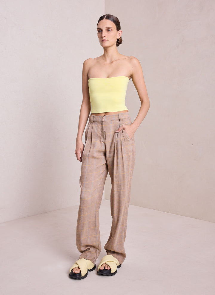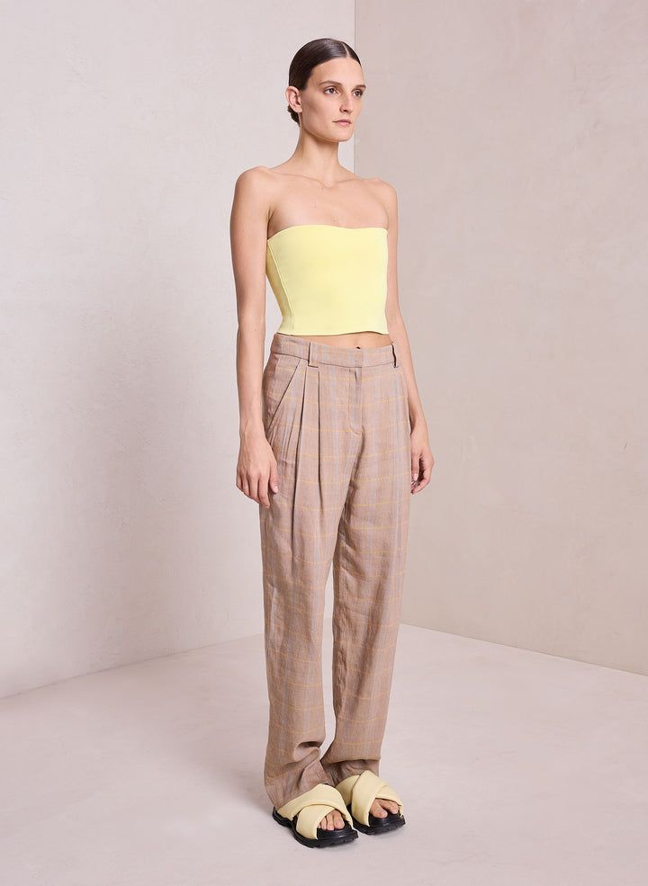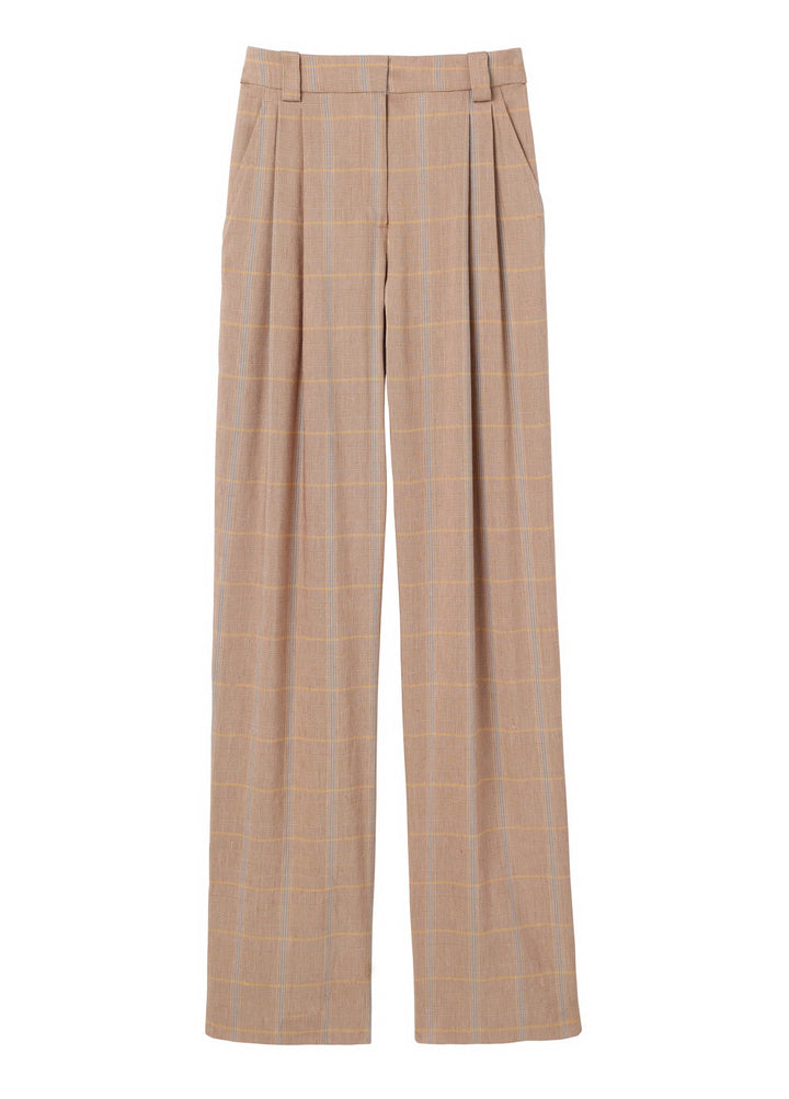 DescriptionThe Fynn Pant is impeccably tailored from a lightweight linen viscose blend in a brown plaid print. This straight-leg silhouette is intended for a drapey, loose fit, featuring a mid-rise waist, front pleating, and slash pockets. Shop Bottoms