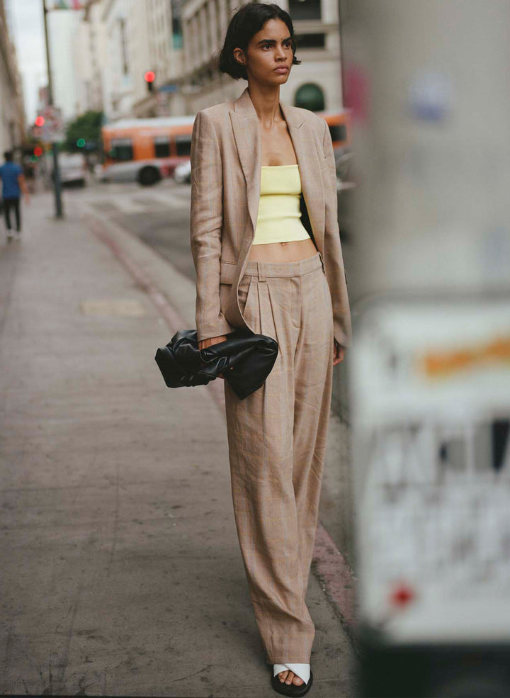 Styling Tip: ?For a refreshingly feminine take on tailoring, wears yours with a sculptural knit top and slide sandals.