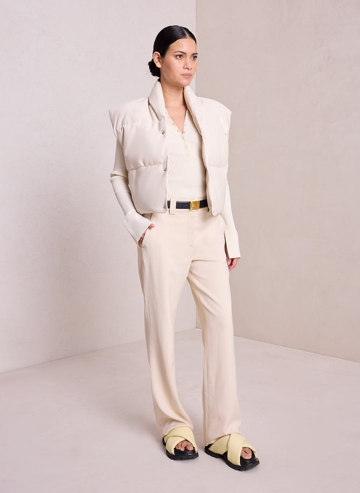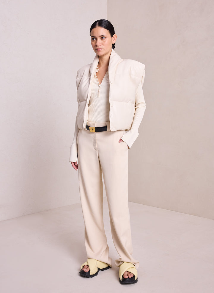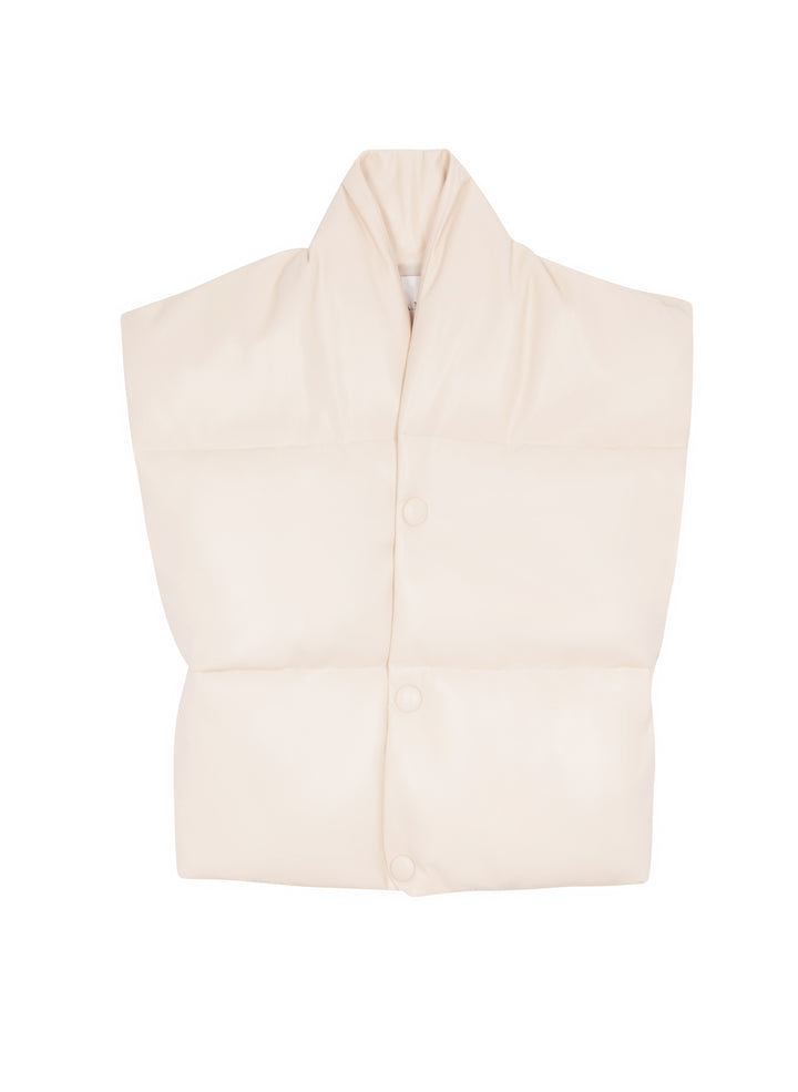 DescriptionThe Willow Vest is crafted from our buttery vegan leather in a creamy off-white hue. This cropped silhouette features a pillowy quilted design with covered snap buttons and a stand collar to cradle the neck. Shop Jackets Styling Tip: Toss on over a fitted knit top with trousers and a belt for sculptural polish.
