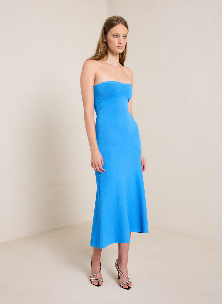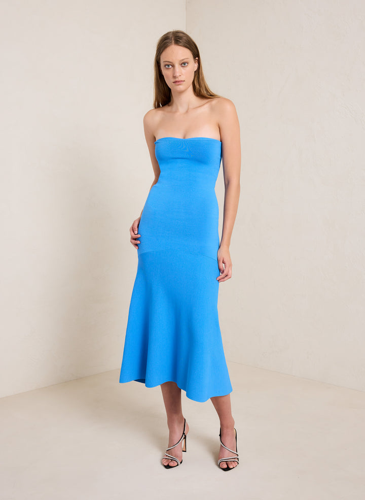 DescriptionThe Dress is knitted from our soft rayon fabrication in a bright blue hue. This strapless, midi silhouette has a built-in bra featuring a slight sweetheart neckline and dropped waist. Shop Dresses
