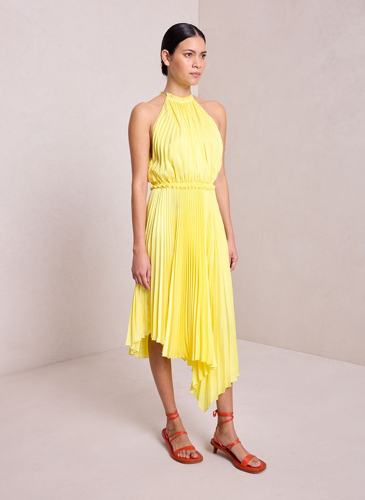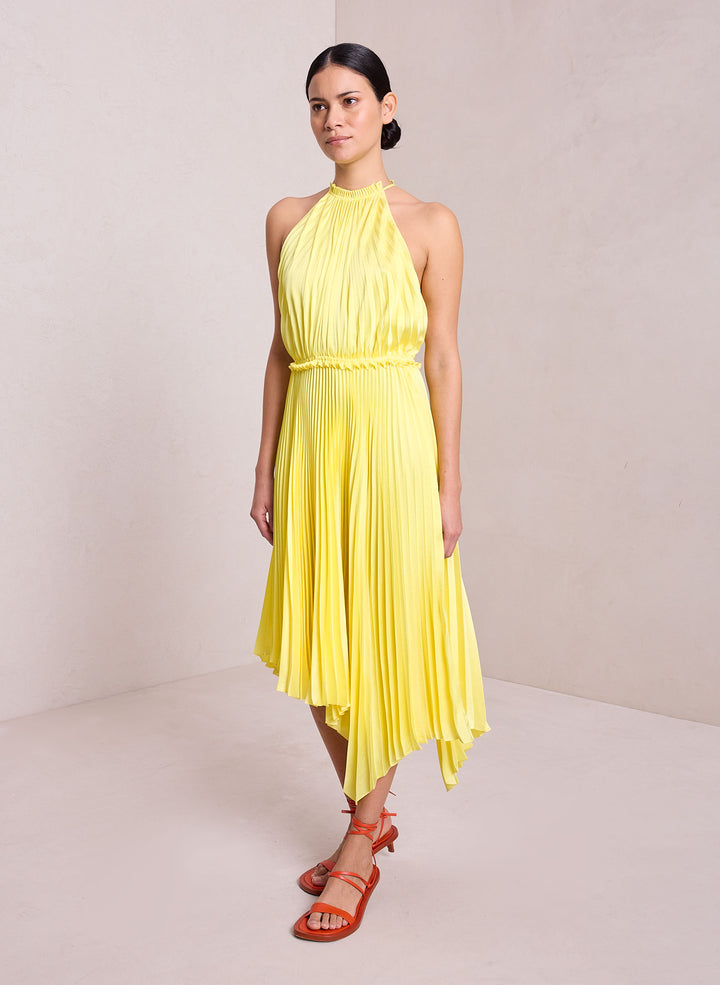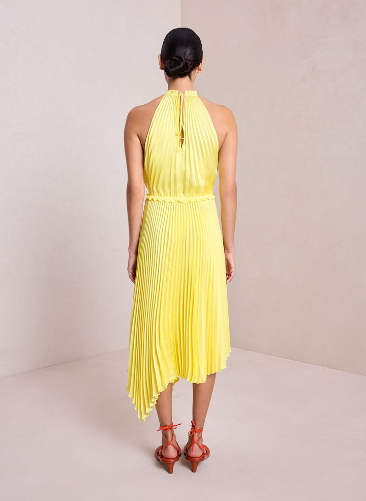 DescriptionThe Claudia Dress is asymmetrically draped and pleated from our pebbled satin fabric in bright yellow. This midi silhouette features a flouncy handkerchief hem, a halter neckline, and ruffled detailing at the waist. Shop Dresses