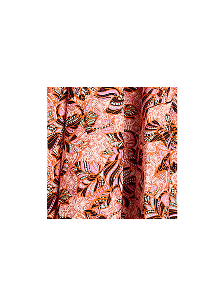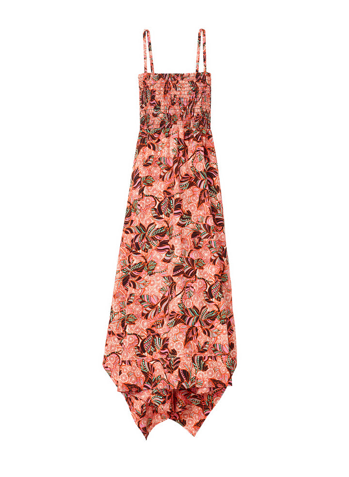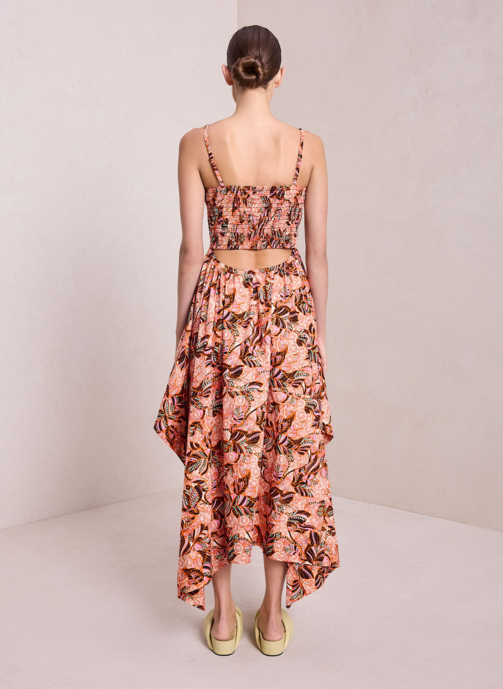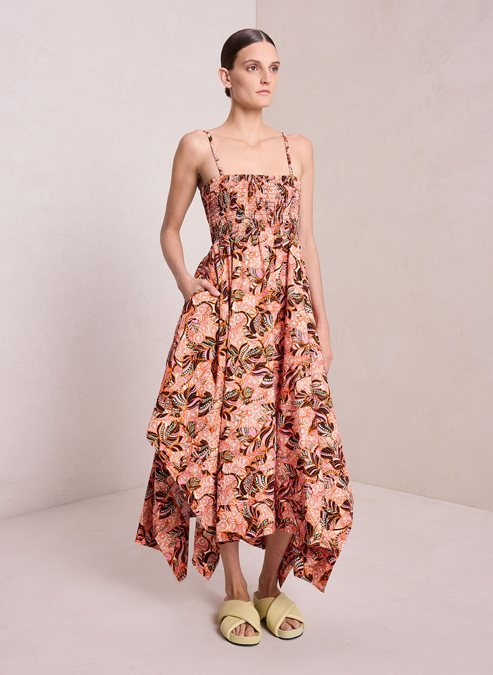 DescriptionThe Adriana Dress is crafted from our washed day cotton fabric in a mod foliage print that combines gorgeous pinks, reds, and purples. This midi silhouette evokes modern feminity through a flouncy handkerchief hem, smocked bodice, and cutout low back. Shop Dresses