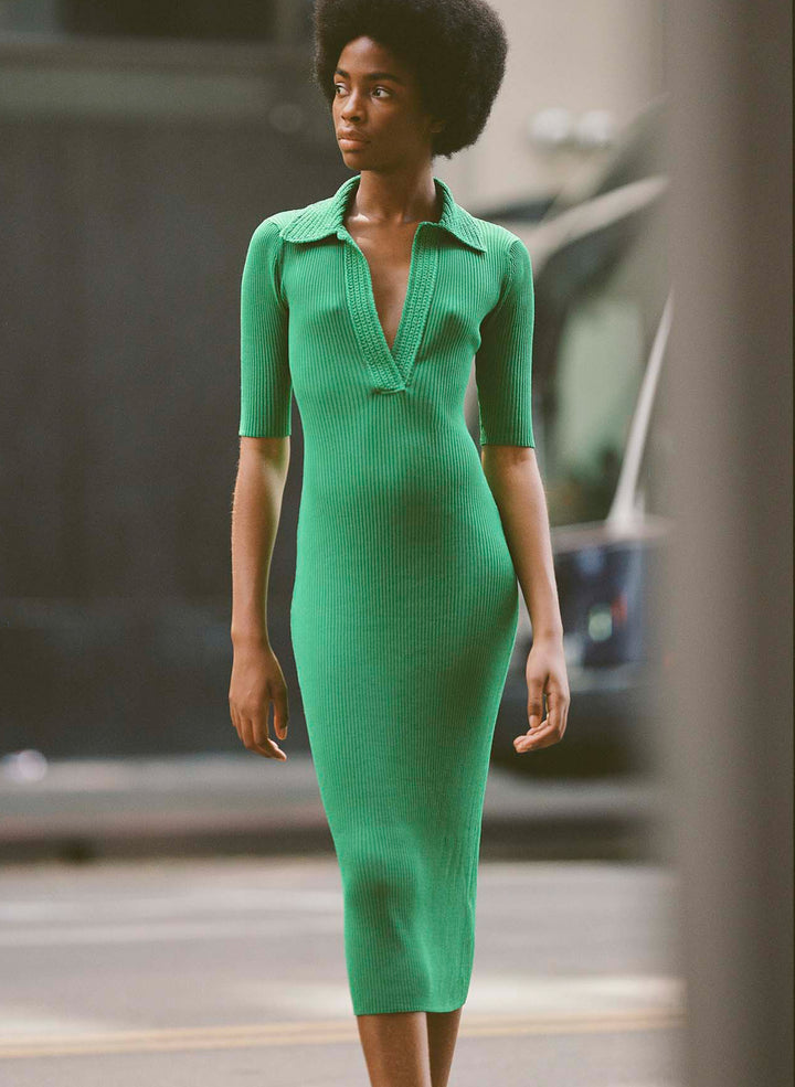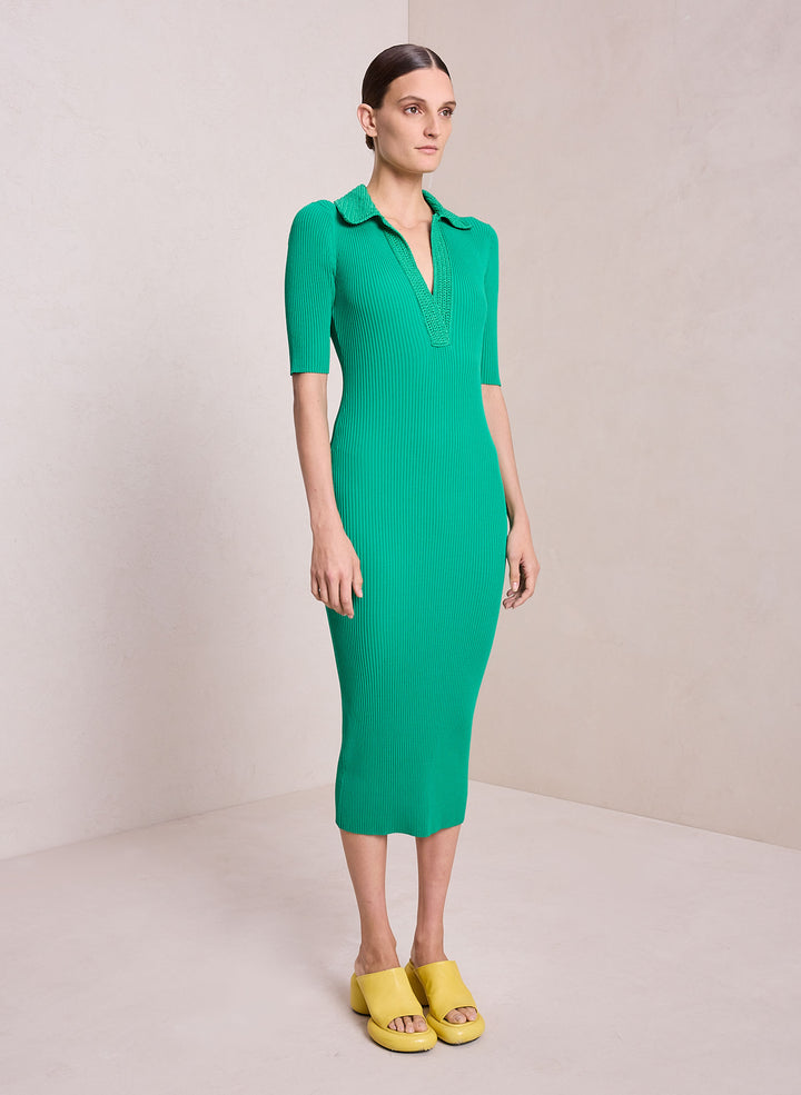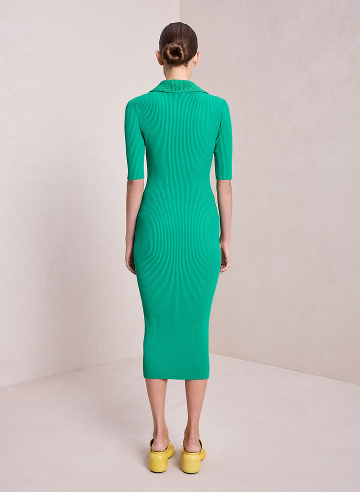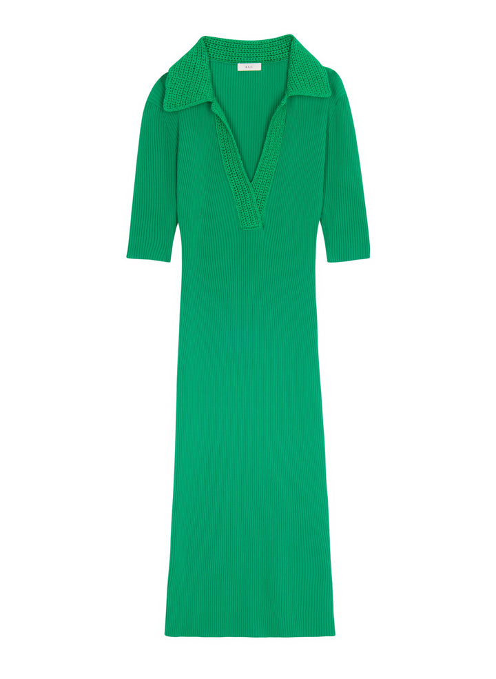 DescriptionThe Adrian Dress is crafted from a dry viscose blend fabric in a bright green hue. This fitted silhouette is ribbed, featuring an intricately crocheted polo collar neckline with a warm-weather feel. Shop Dresses