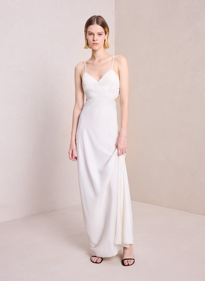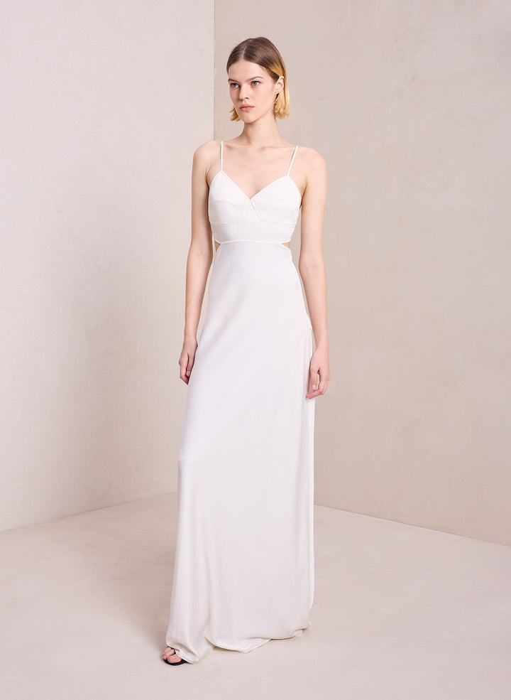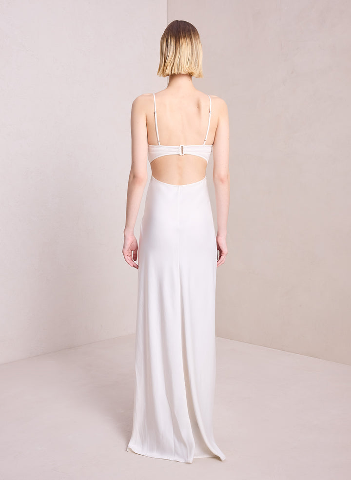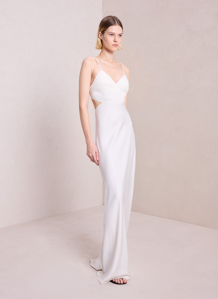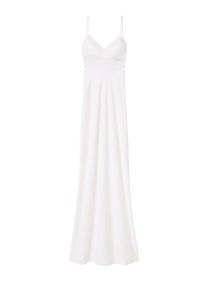 DescriptionThe Blakely II Dress is crafted from our elegant stretch satin in bright white. This floor-length gown features a bustier-inspired bodice with side cutouts and an open back, modernizing the classic slip. Shop Dresses