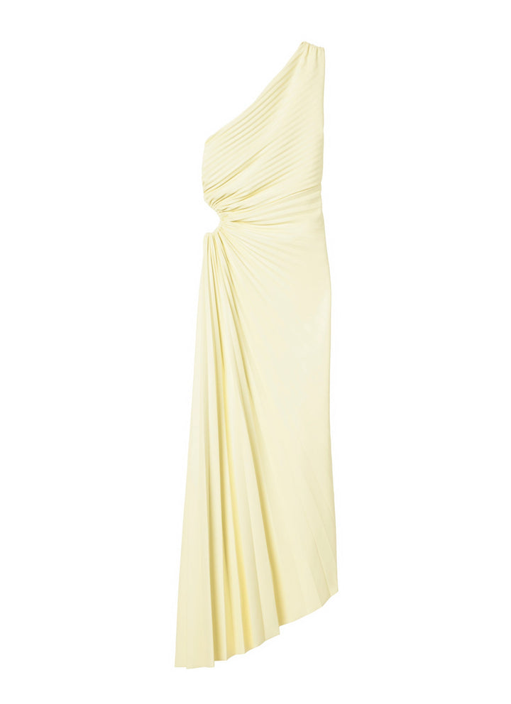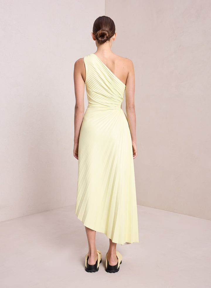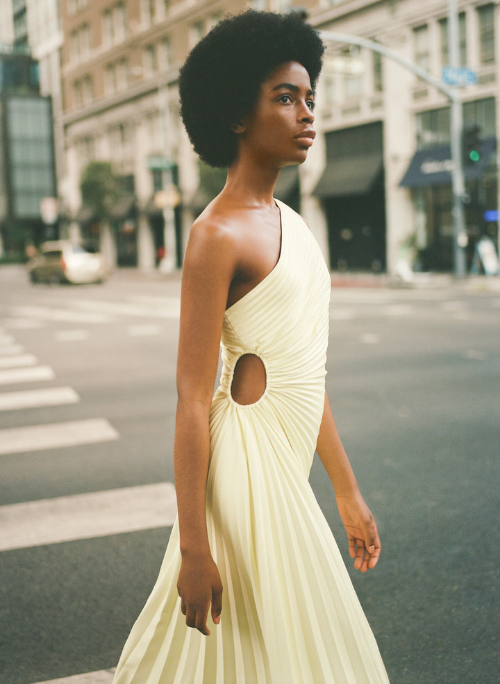 DescriptionThe Delfina Dress is asymmetrically draped and pleated for the first time from our buttery vegan leather in cheery canary yellow. This one-shoulder silhouette features a confident side cutout and high-low hem. Shop Dresses