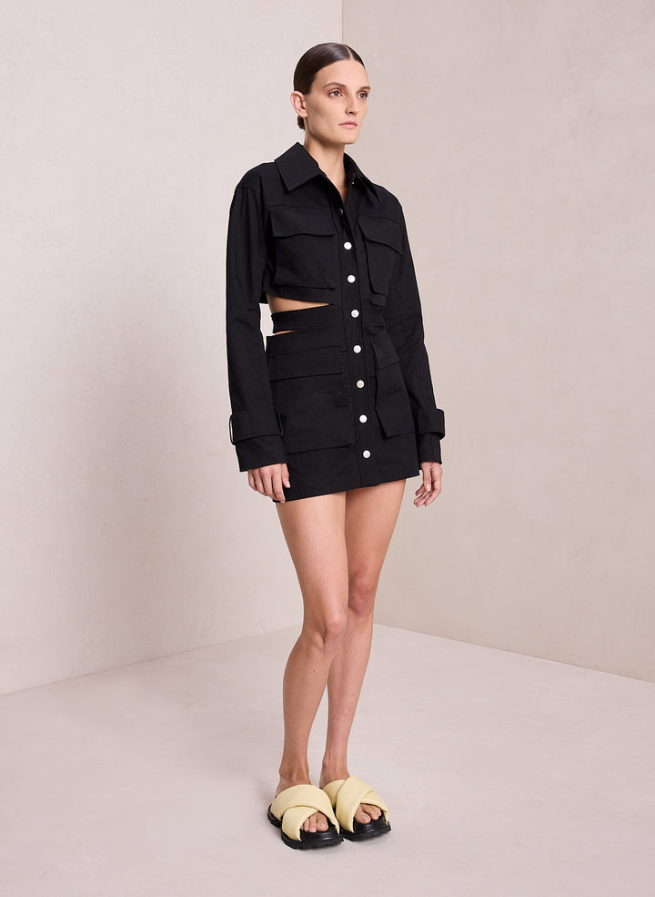 DescriptionThe Wyatt Dress is crafted from our structured utility cotton blend fabric in essential black. Exaggerated pockets, a cutout, belted waist and wide sleeve straps, this collared silhouette takes inspiration from safari style. Shop Dresses
