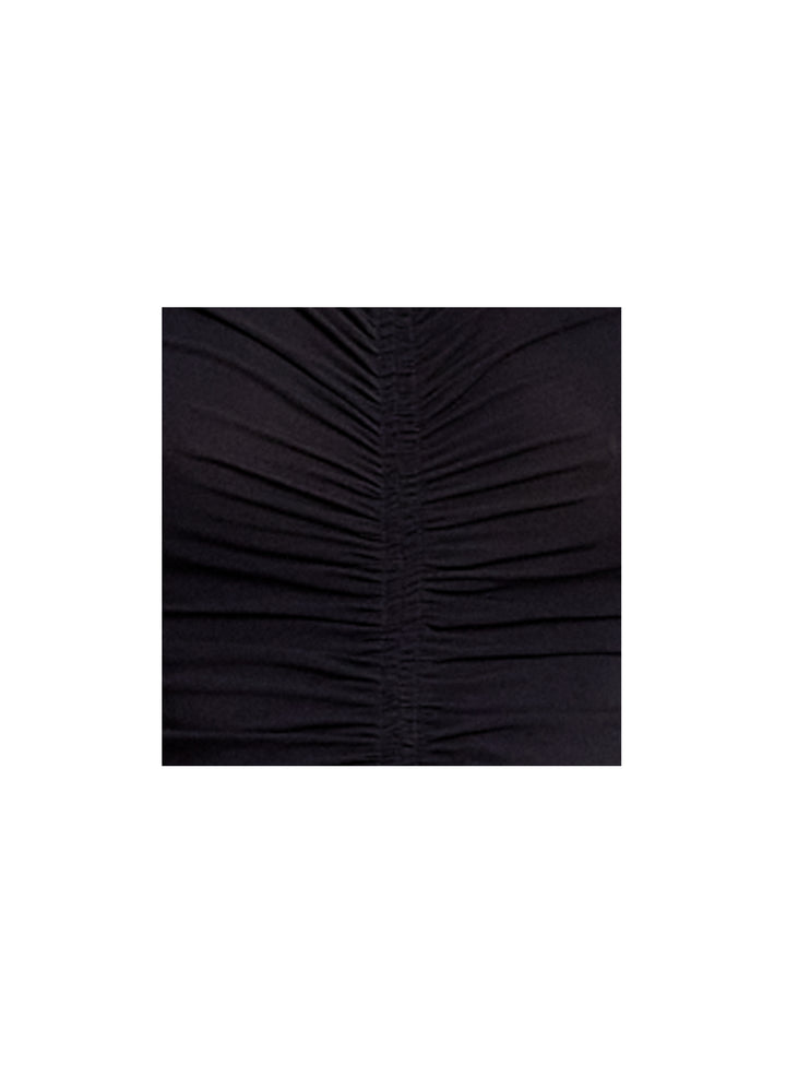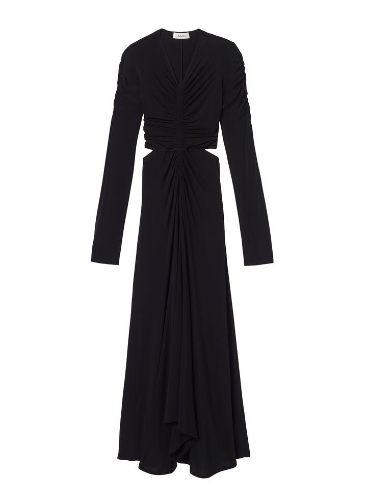 DescriptionThe Mona Dress is crafted from our stretch silk fabric in a classic black. This midi silhouette evokes modern feminity via ruched detailing along the sleeves and overlapping bodice detailed with side cutouts that wrap around to reveal a low open back. A high V-neckline and handkerchief hem complete the look. Shop Dresses Styling Tip: For standout style at work or an event, pair with platform sandals or barely-there stilettos in a bright color.