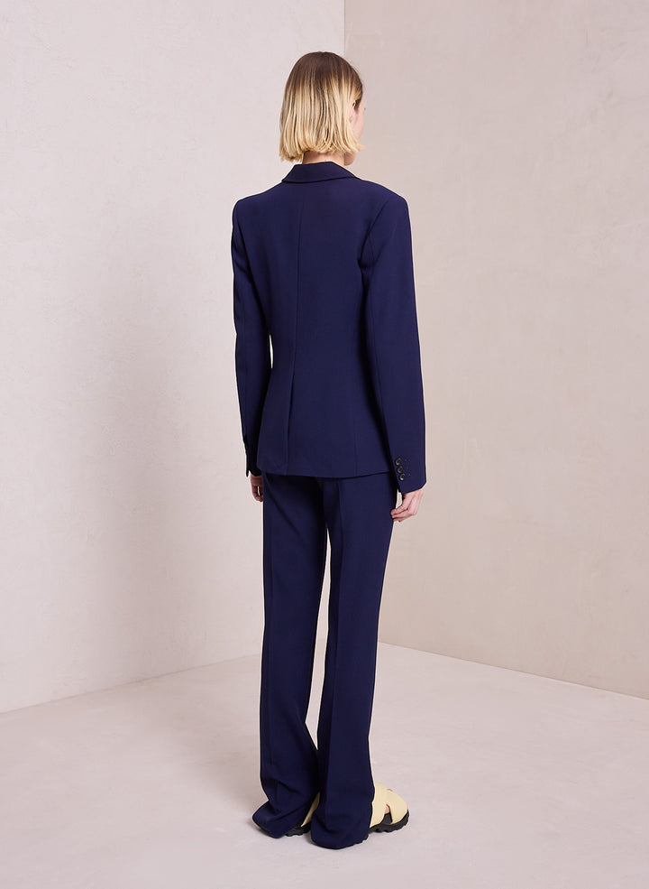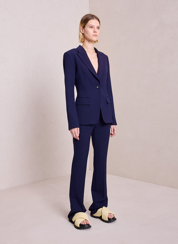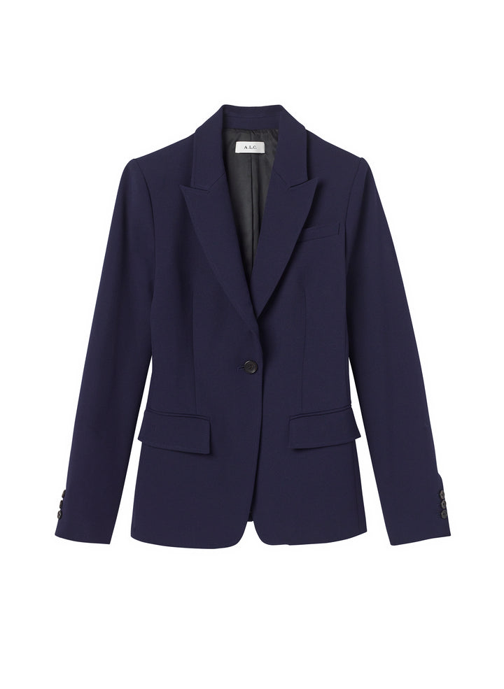 DescriptionThe Edie Jacket is crafted from our refined suiting fabric in timeless French navy. This best-selling silhouette is cut for a tailored look, featuring structured shoulders, sharp lapels, and a single button closure. This jacket fits true to size. Shop Jackets