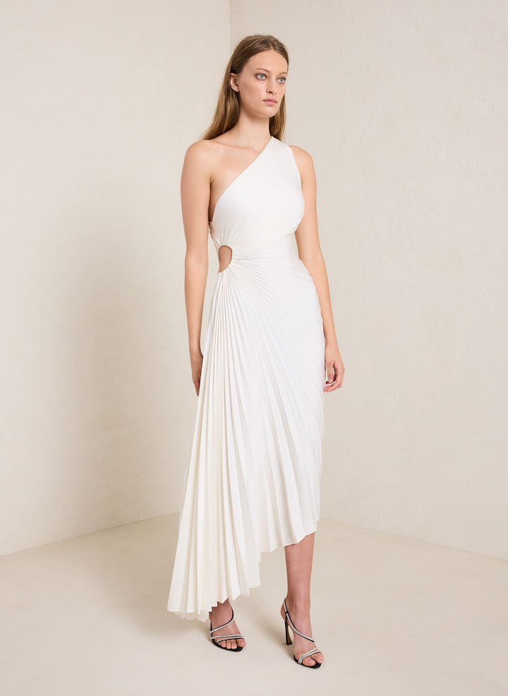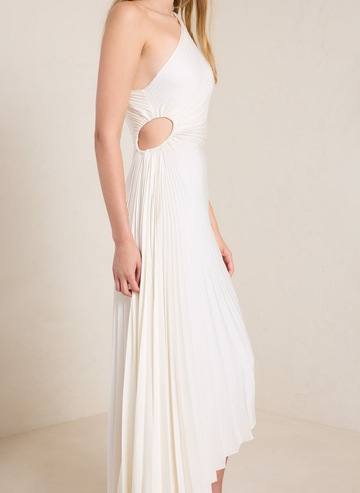 DescriptionThe Delfina Dress is asymmetrically draped and pleated from our vintage satin fabric in a lustrous winter white shade. This one-shoulder silhouette features a confident side cutout and high-low hem. Shop Dresses