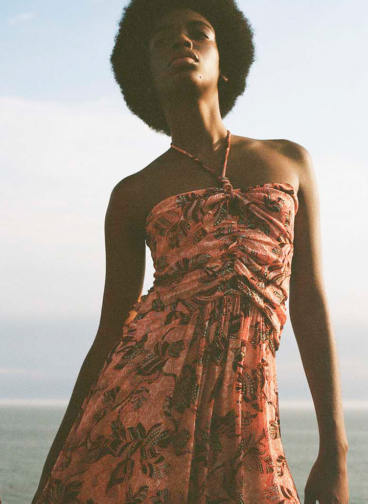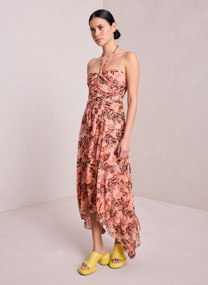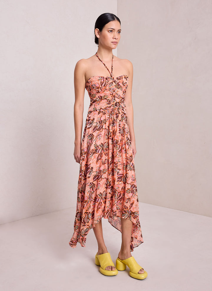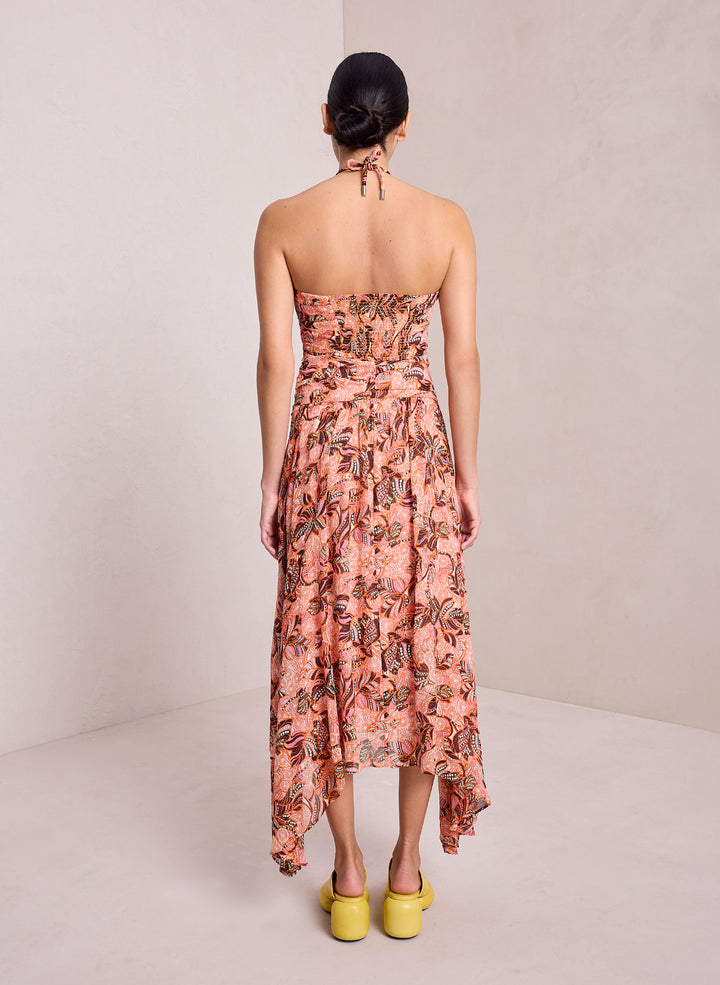 DescriptionThe Violet Dress is crafted from our crinkled silk chiffon fabric in a mod foliage print that combines gorgeous pinks, reds, and purples. This midi silhouette evokes modern feminity through a flouncy handkerchief hem, a ruched bodice with a halter neckline, and a smocked back. Shop Dresses