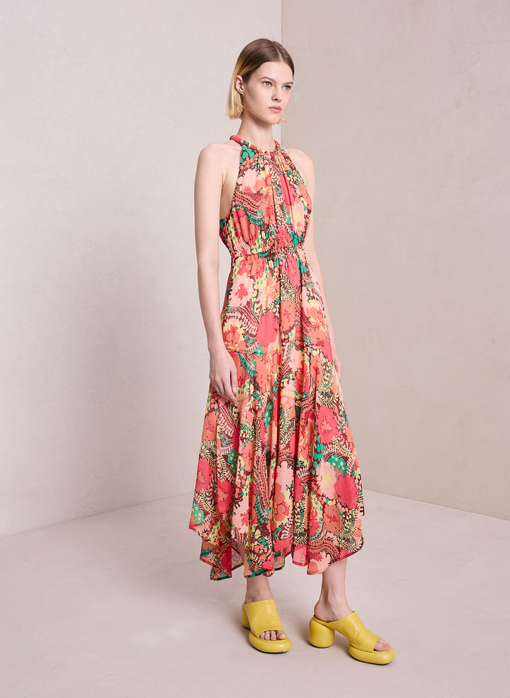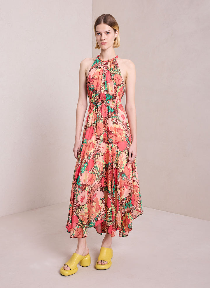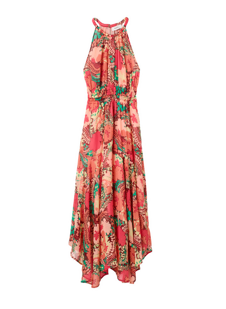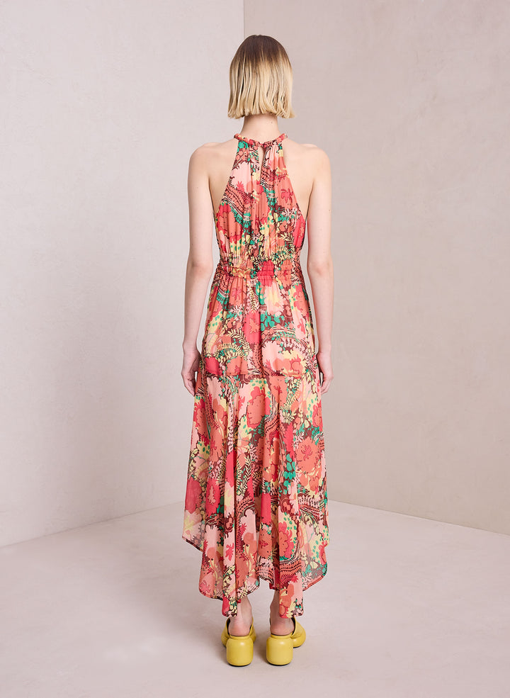 DescriptionThe Ellie Dress is crafted from our crinkled silk chiffon fabric in an abstract floral print that combines gorgeous pinks, reds, and greens. This midi silhouette features a halter neck, scarf hemline, and a shape-enhancing smocked waist. Shop Dresses