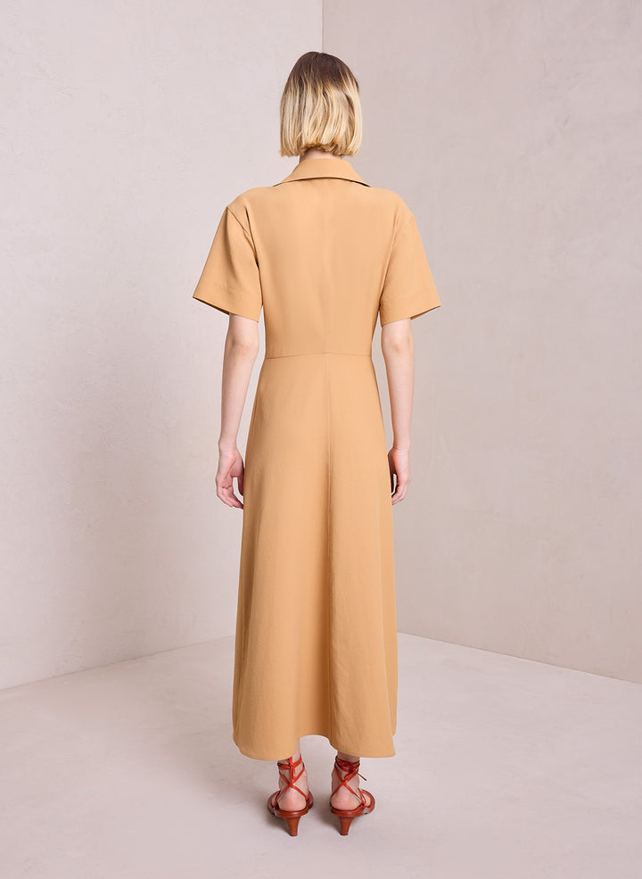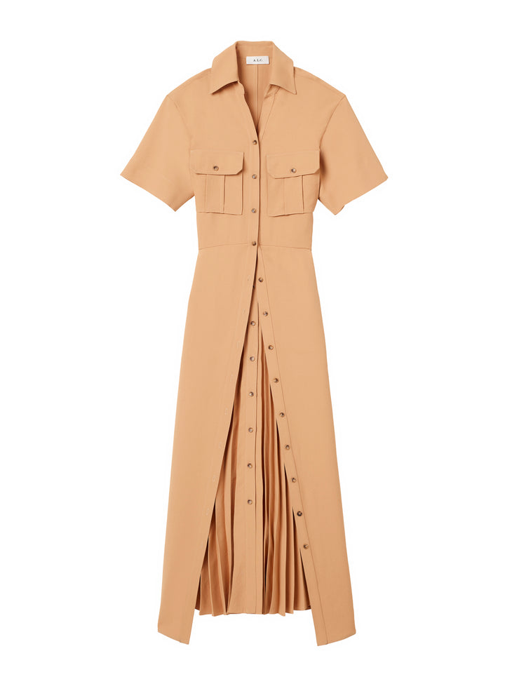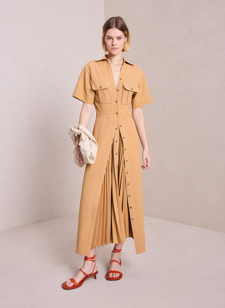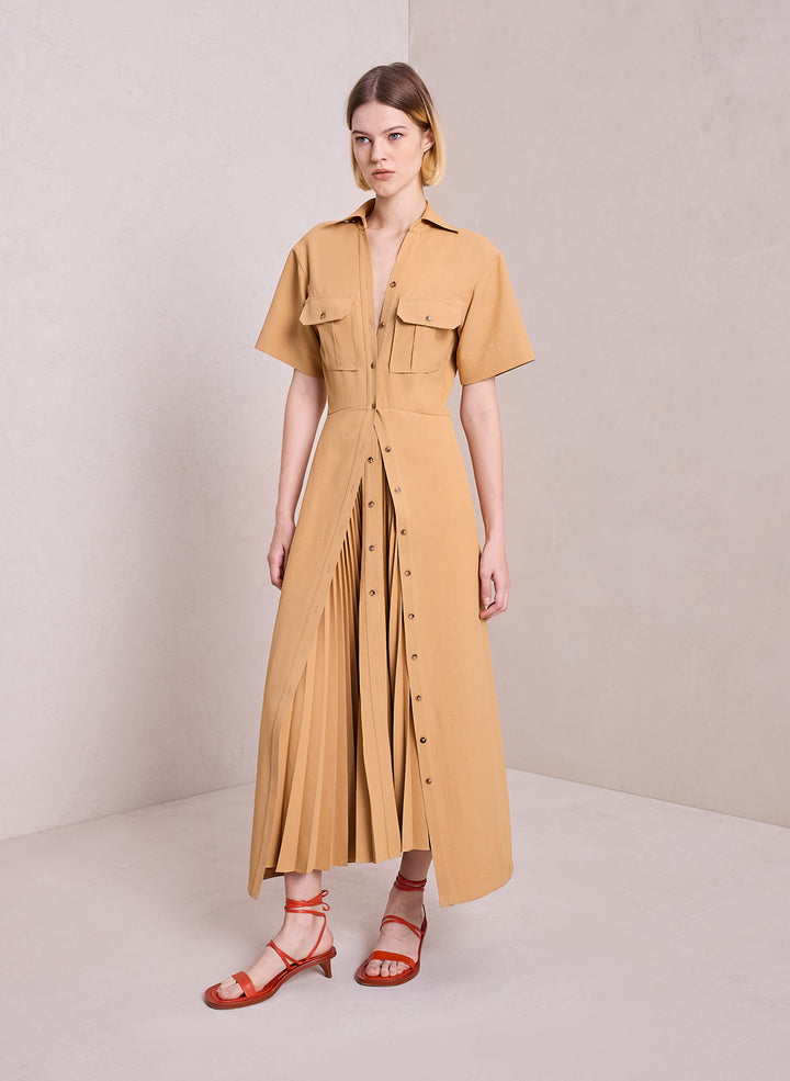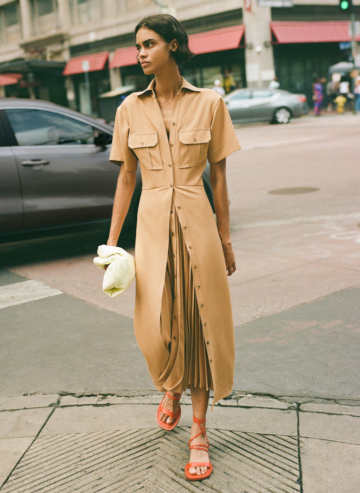 DescriptionThe Florence Dress is intricately woven and pleated from warm beige fabric for structural fluidity. This midi silhouette takes inspiration from safari style, featuring a collared neckline, flap pockets, and a double-layer skirt detailed with tortoise buttons, contrast topstitching, and layered skirt pleating. Shop Dresses