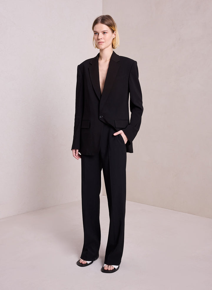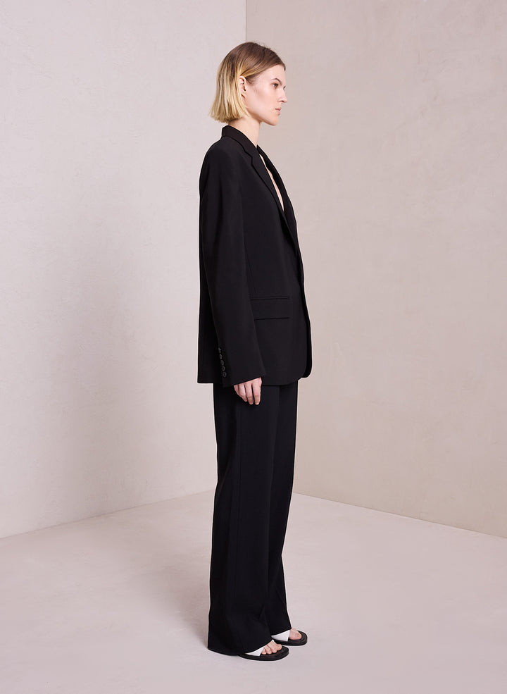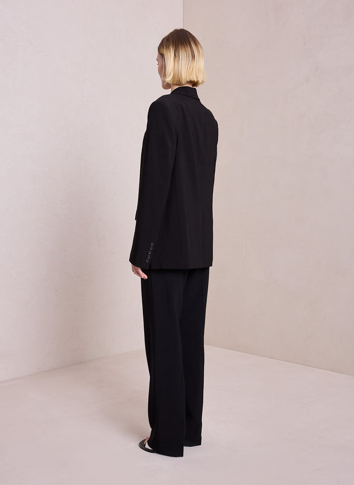 DescriptionThe Dakota Jacket is crafted from our fluid viscose fabric in essential black. This tailored silhouette is cut for an oversized fit, featuring notch lapels and a single button closure. ??Shop Jackets