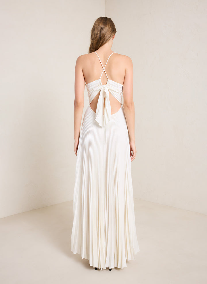 DescriptionThe Aries Dress is crafted from our lustrous vintage satin fabric in a lustrous winter white shade. This maxi silhouette features thin straps that cross in the back atop a cinched cutout secured with ties. Shop Dresses
