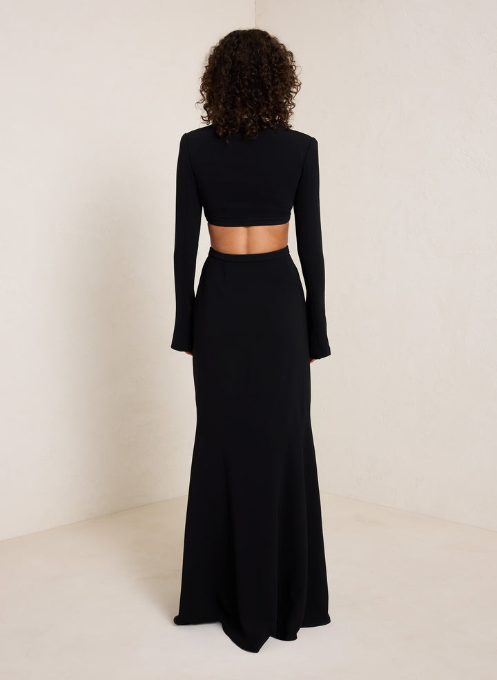 DescriptionThe Issa Dress is impeccably cut from cheerful black fabric. This maxi silhouette, designed for elegant events, features long and slim sleeves, a plunging neckline, and waist cutouts that wrap around into an open back. Shop Dresses