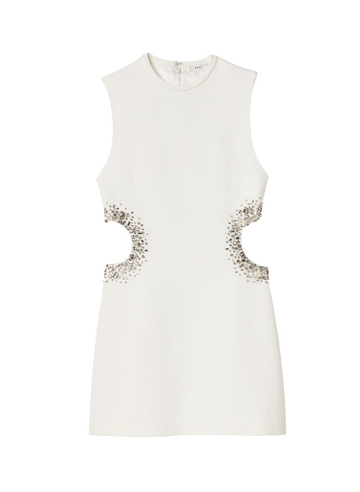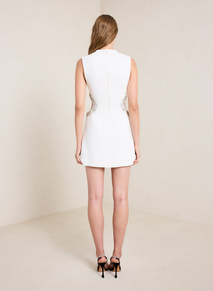 DescriptionThe Skye Dress is impeccably cut from winter white fabric enhanced with shimmering rhinestones. This mini silhouette is sleeveless with a high round neckline and two side cutouts. Shop Dresses