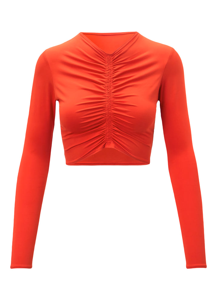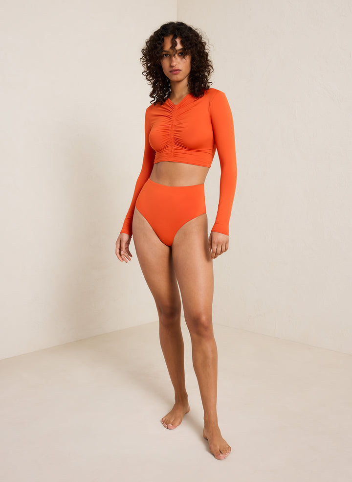 DescriptionThe Ansel Rashguard is crafted from our soft recycled nylon blend in an orange-red hue, featuring long sleeves and ruched detailing. Shop Swimsuits Styling Tip: Pair with coordinating bikini bottoms and finish with sporty sandals.