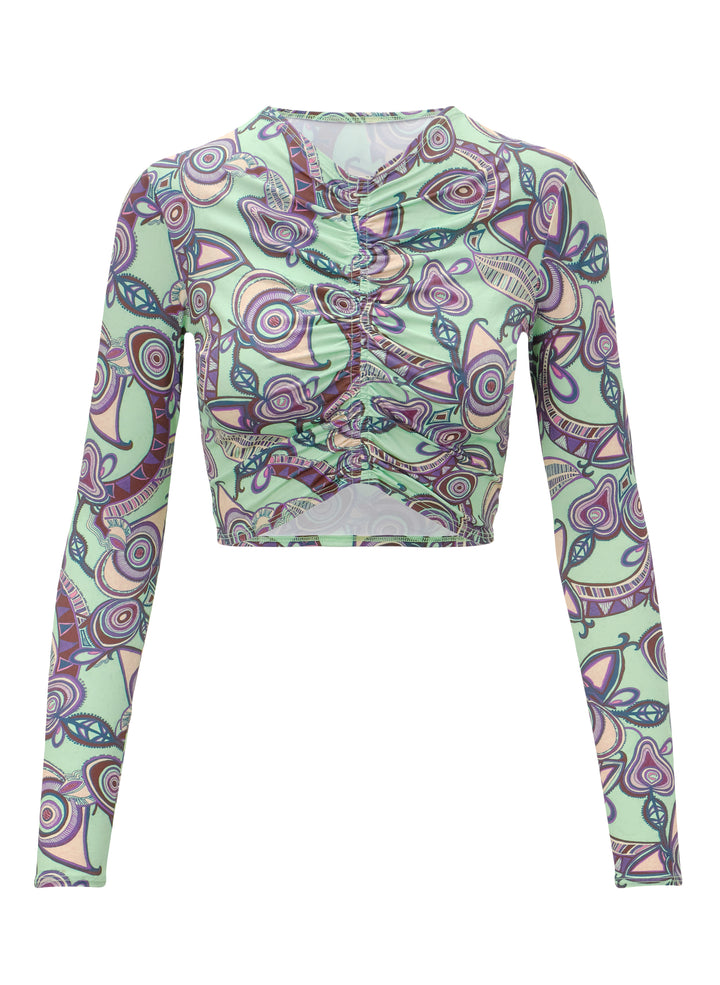 DescriptionThe Ansel Rashguard is crafted from our soft recycled nylon blend in a printed purple and mint motif, featuring long sleeves and ruched detailing.Shop Swimsuits