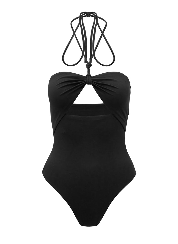 DescriptionThe Anita Swimsuit is crafted from our soft recycled nylon blend in timeless black. A knot detail accentuates the bandeau silhouette, featuring a halter neckline with adjustable ties and a keyhole cutout. Shop Swimwear