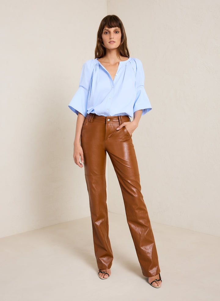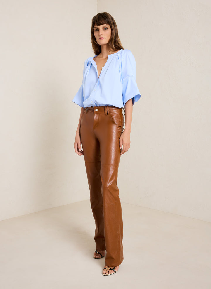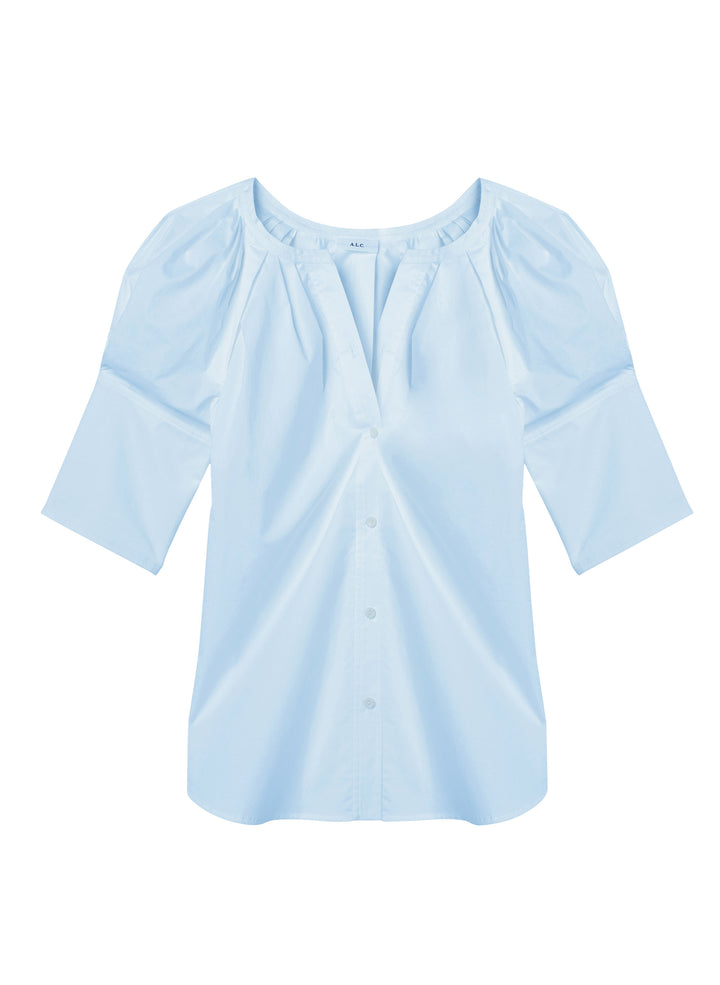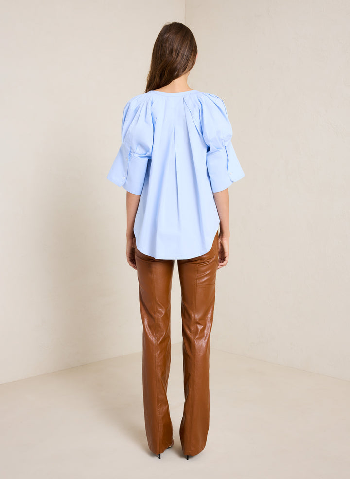 DescriptionThe Chloe Top is crafted from our airy cotton twill fabric in a sky-blue hue. This voluminous silhouette features pleated puff sleeves with oversized cuffs and a button placket. For a less oversized fit, we recommend sizing down one size. Shop Tops