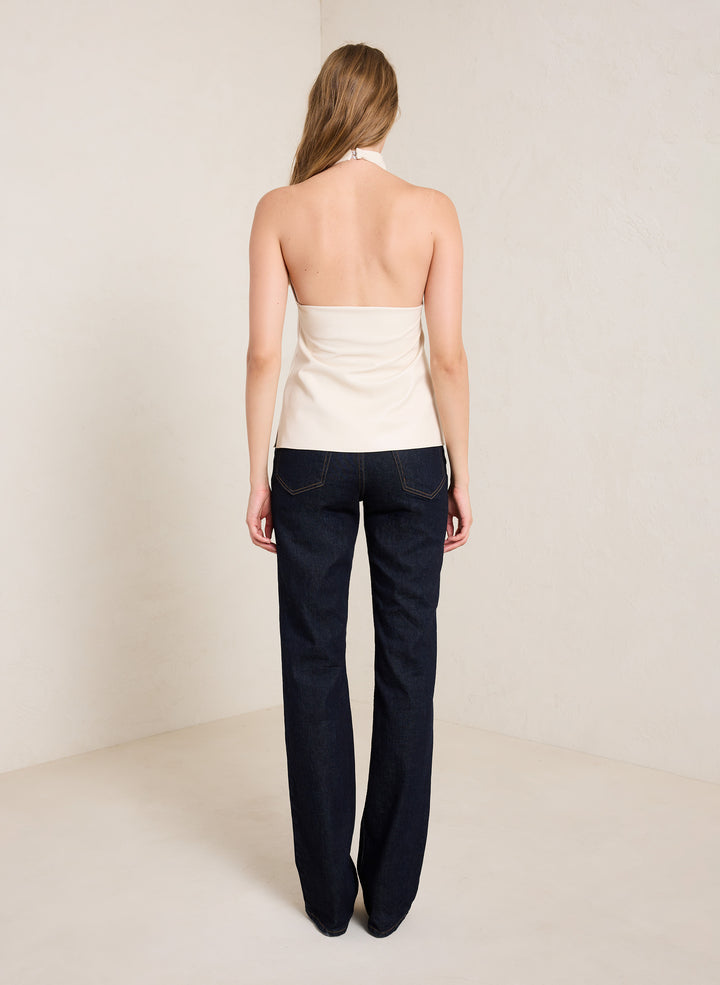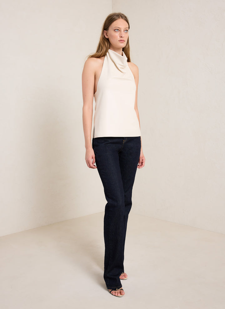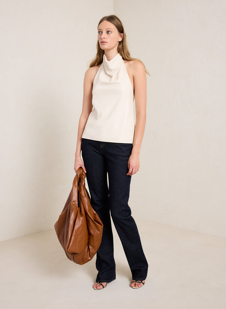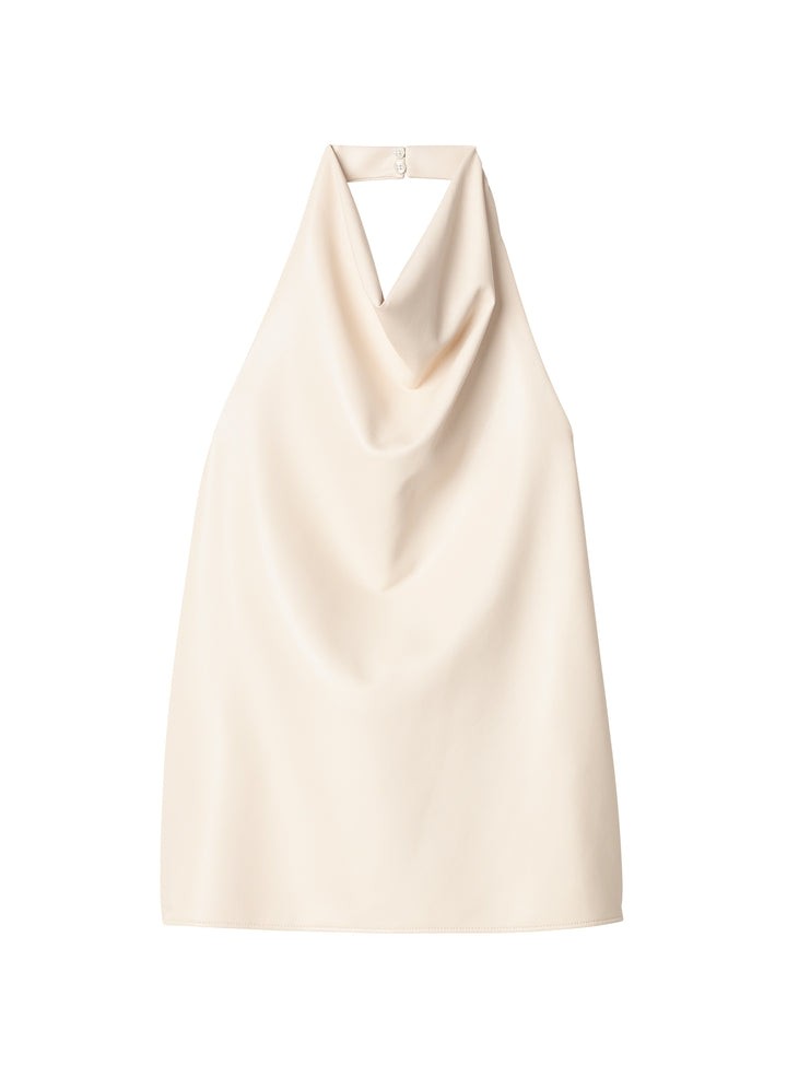 DescriptionThe Aisha Top is crafted from our suede-back vegan leather in a creamy off-white hue. This minimalist silhouette features a striking modern cowl neck and open halter back. Shop Tops
