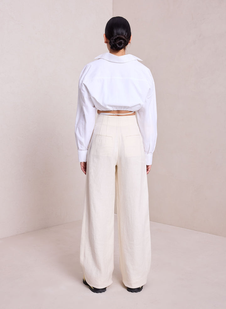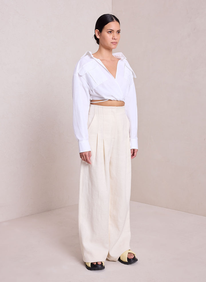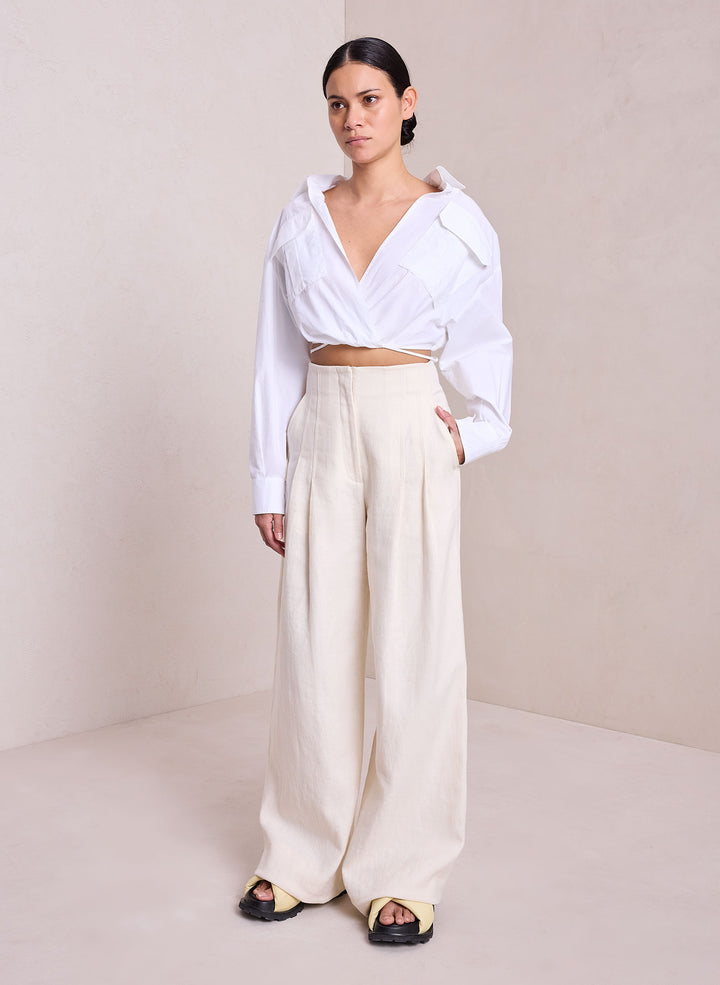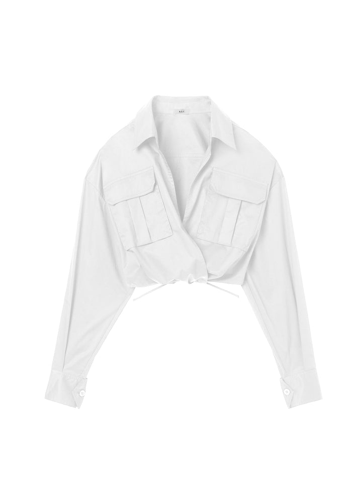 DescriptionThe Corbin Top is crafted from crisp cotton in wardrobe-essential white. This cropped silhouette takes inspiration from safari style, featuring a wide-collared neckline, flap pockets, and tie-detailing around the waist. Shop Tops