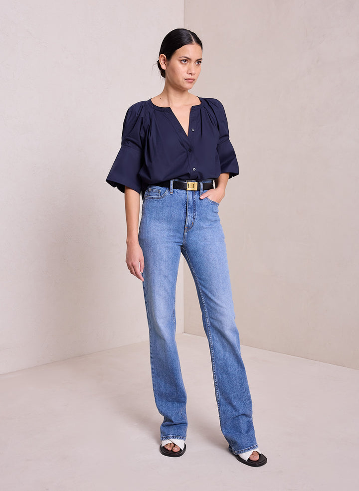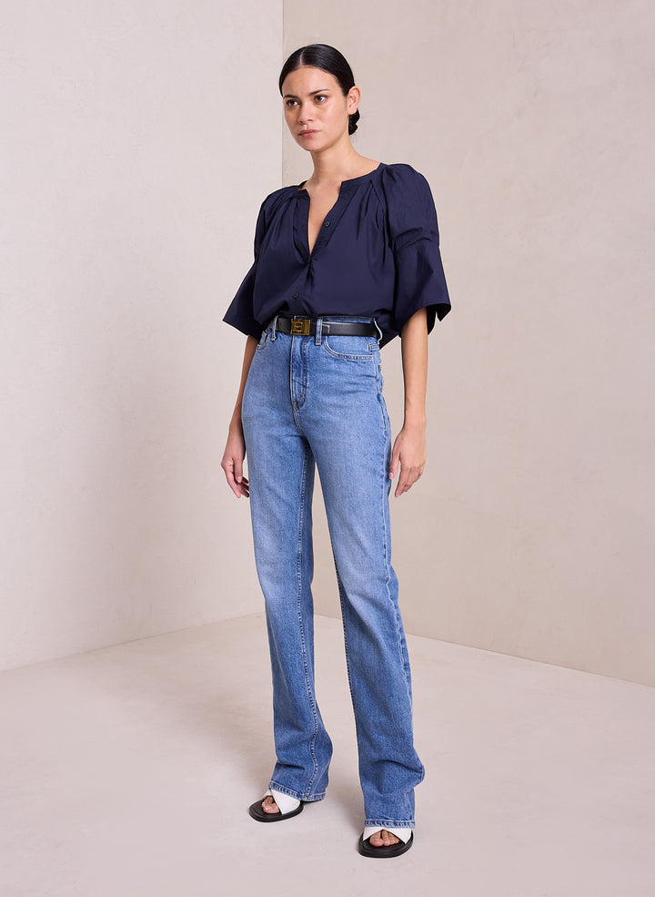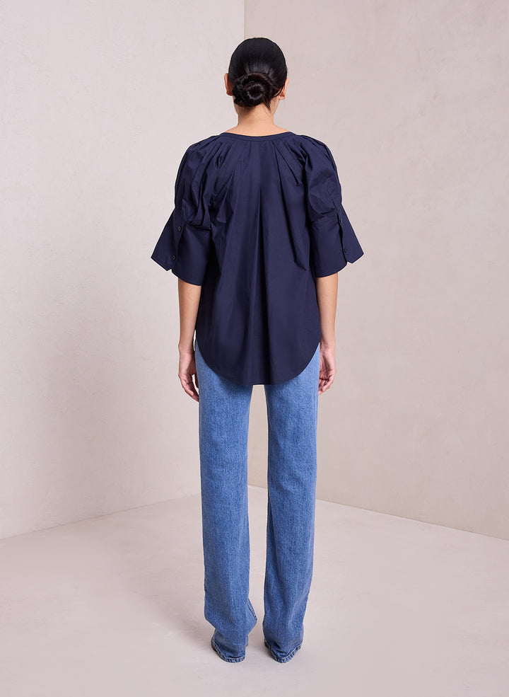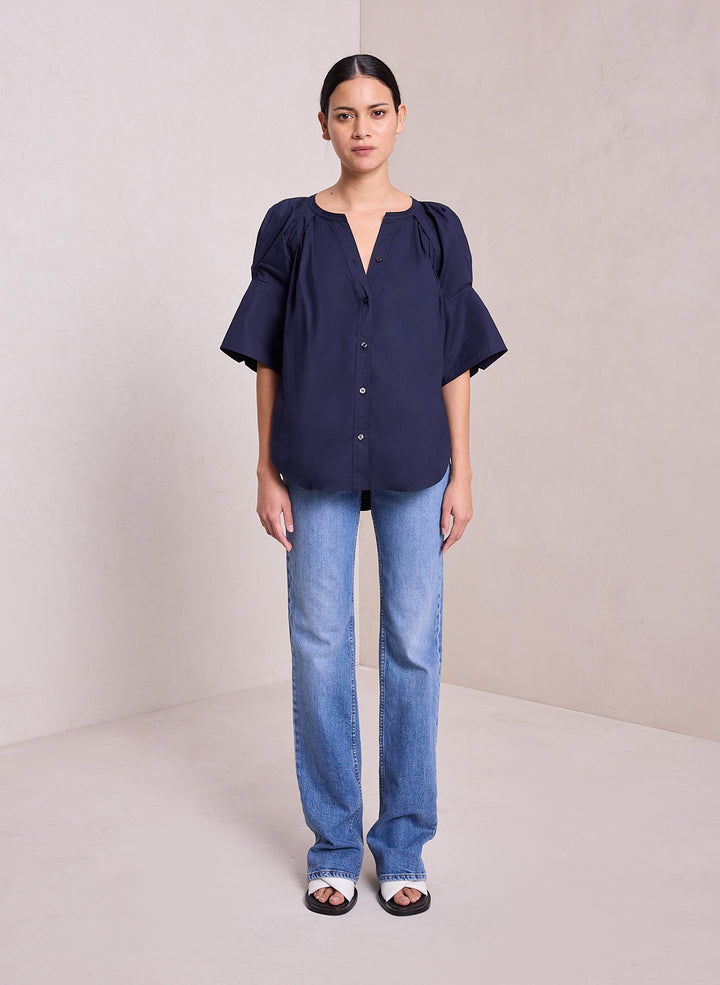 DescriptionThe Chloe Top is crafted from our crisp, airy day cotton in a deep navy hue. This voluminous silhouette reimagines the classic button-down shirt, featuring a pleated open neckline and short sleeves with oversize cuffs. For a less oversized fit, we recommend taking one size down. Shop Tops