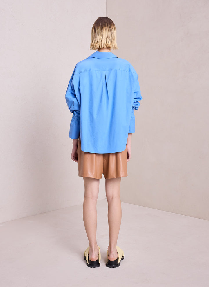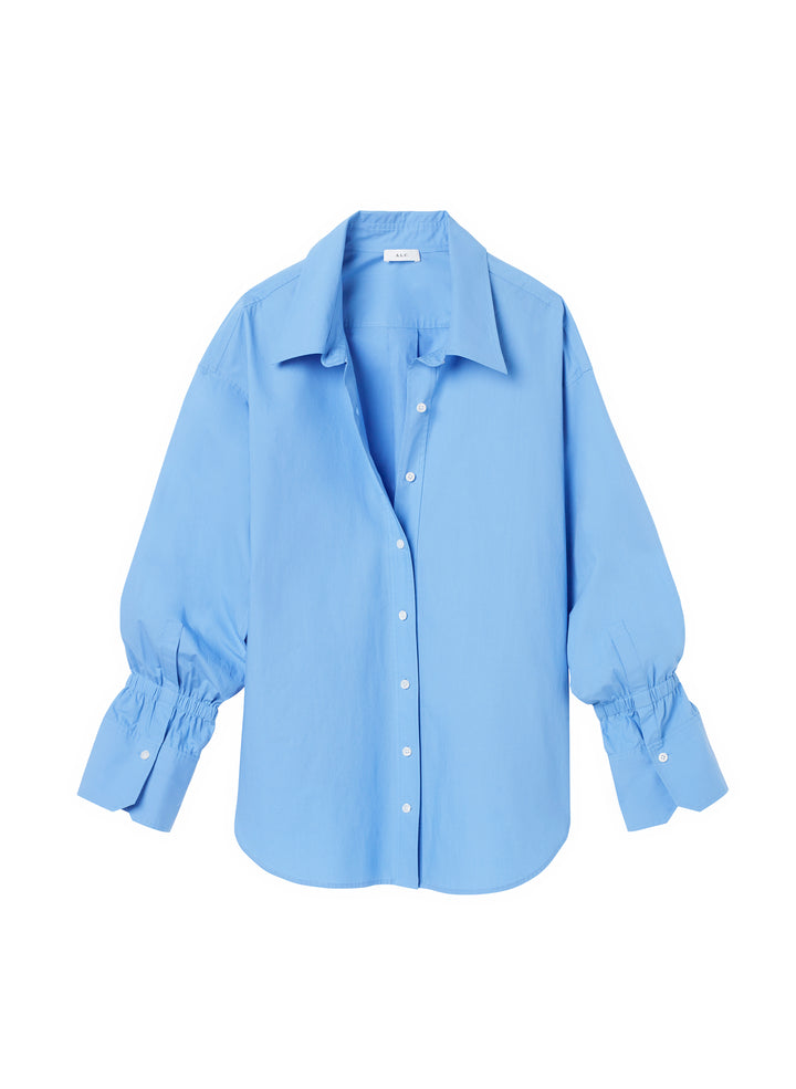 DescriptionThe Monica Top is crafted from our crisp, airy day cotton in an eye-catching blue. Exaggerated cuffed sleeves feature an elasticized detail that allows for an effortless scrunched-up effect. Shop Tops