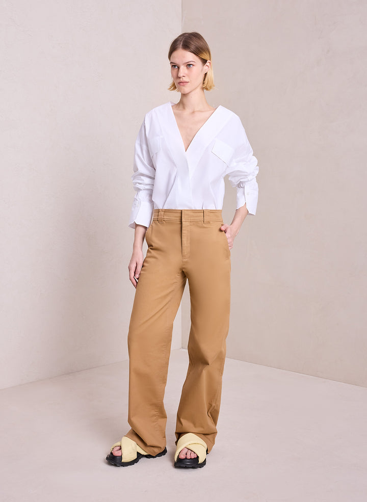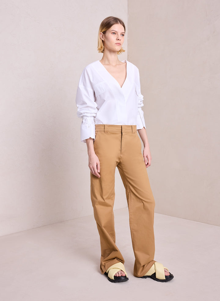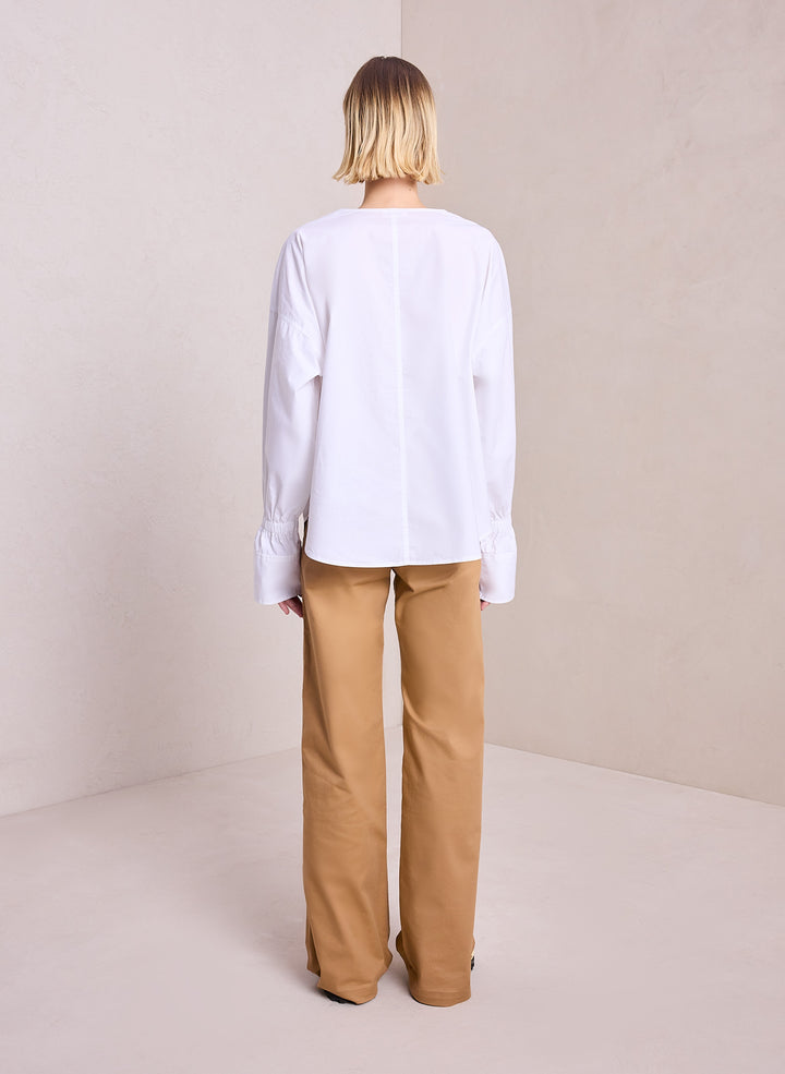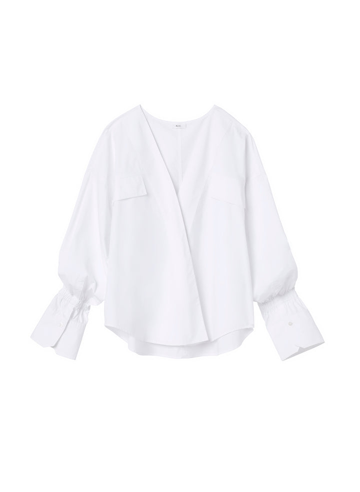 DescriptionThe Colette Top is crafted from our crisp, airy day cotton in essential white. This modern silhouette reimagines the classic button-down shirt, featuring a collarless V-neckline, chest front pockets, and extra-long elasticized cuffed sleeves that allow for an effortless scrunched-up effect. Shop Tops