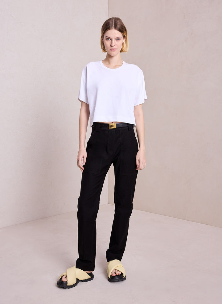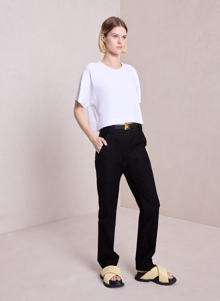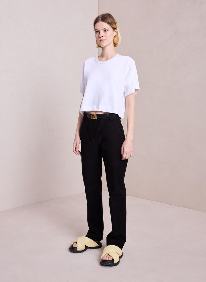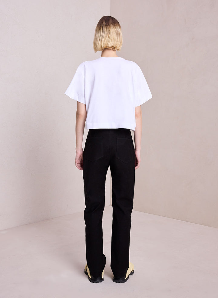 DescriptionThe Oliver Tee is crafted from structured cotton jersey fabric in wardrobe-essential white. This cropped silhouette is cut for a boxy fit, featuring a round neckline and short sleeves. Shop Tops