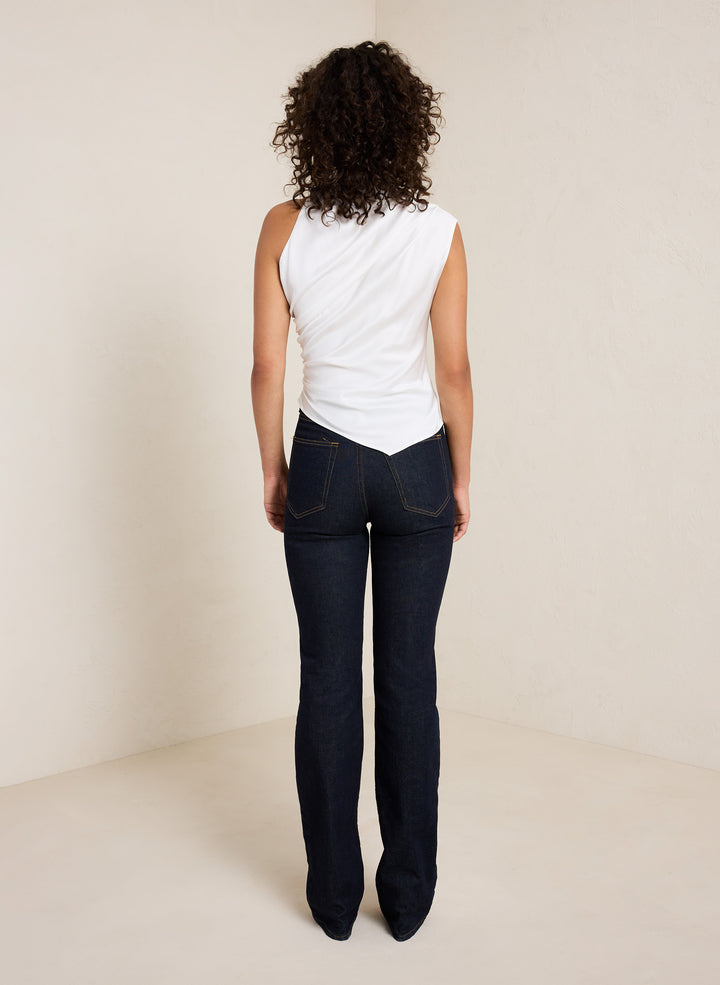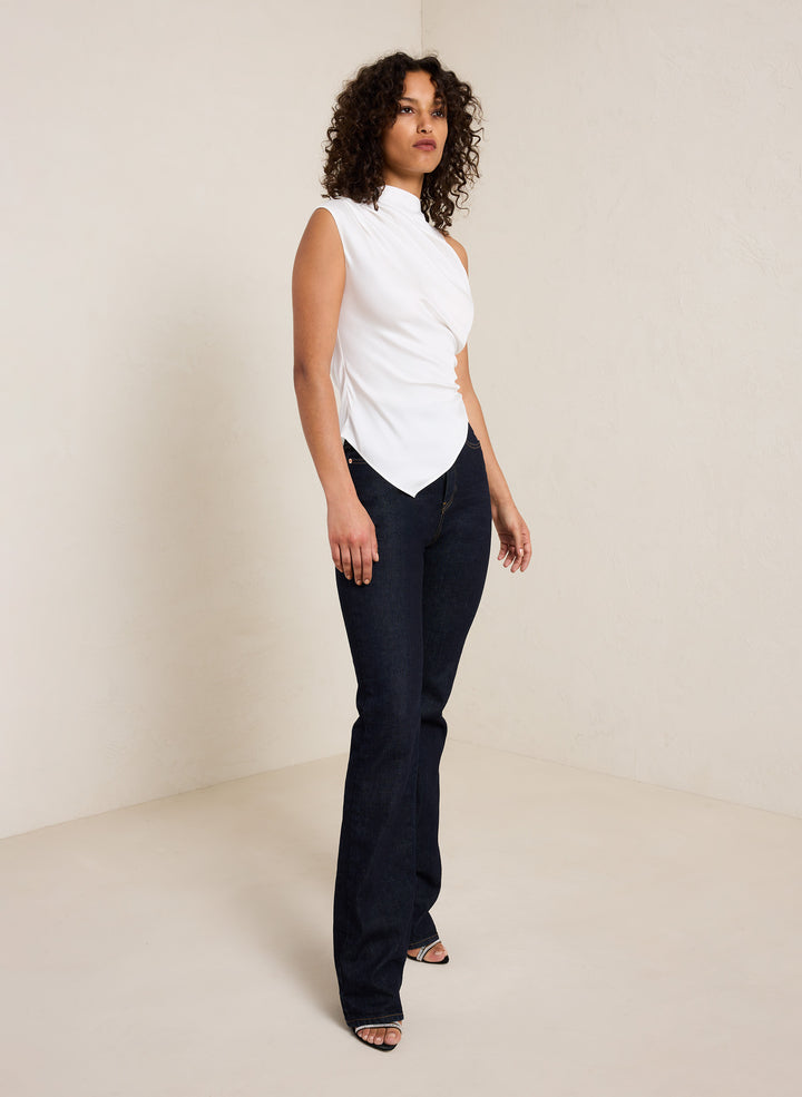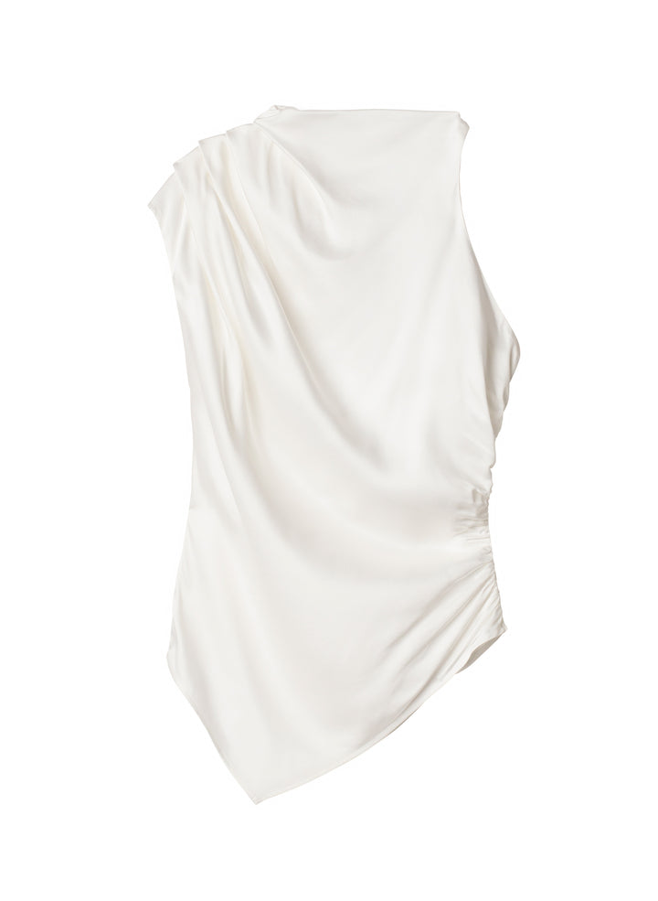 DescriptionThe Jones Top is crafted from our fluid viscose fabric in a soft white shade. This asymmetrically draped silhouette features a single cap sleeve, mock neckline, and handkerchief hem. Shop Tops