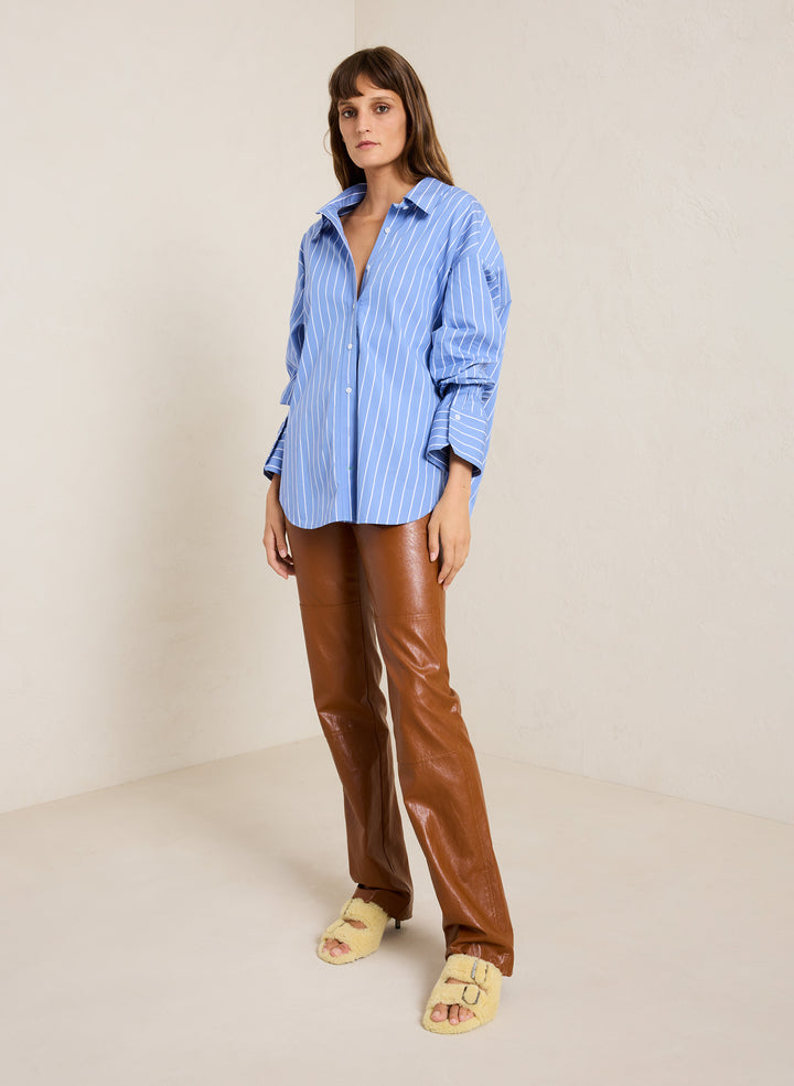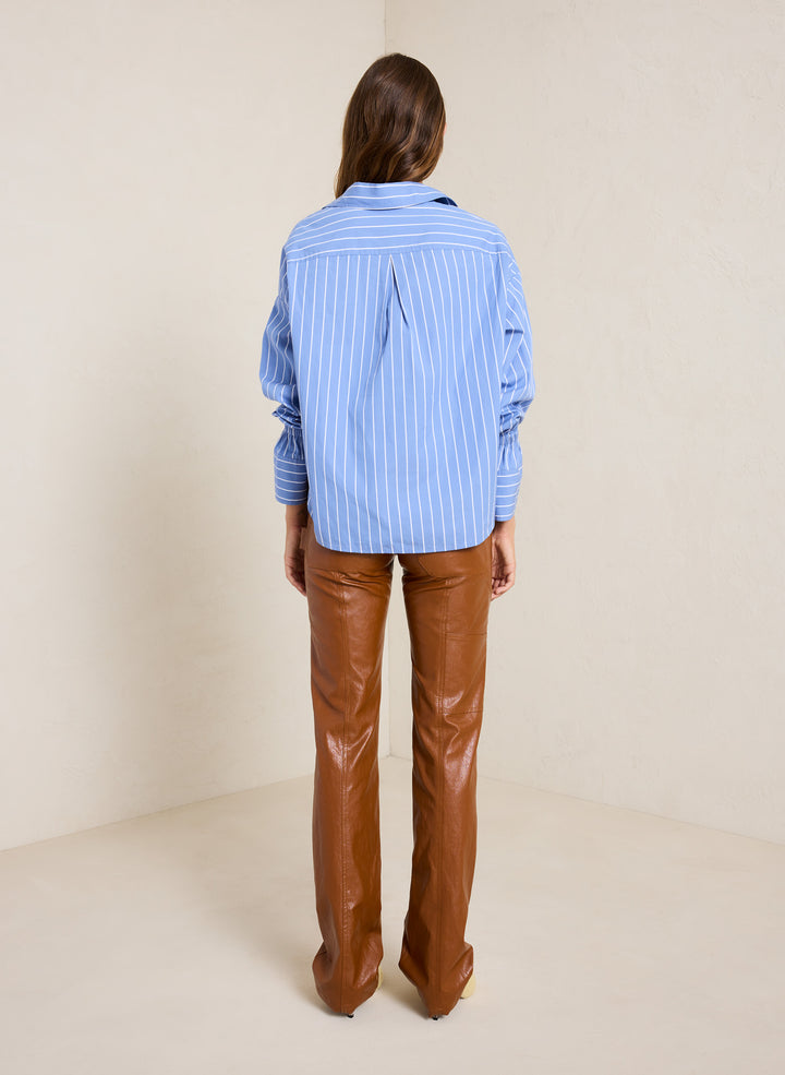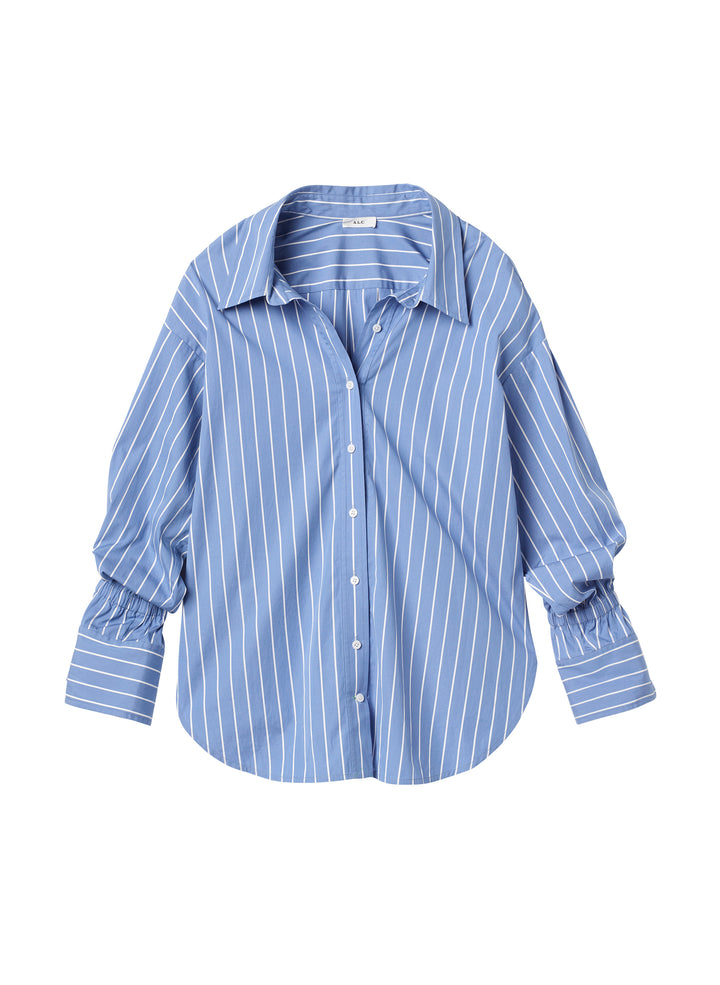 DescriptionThe Monica Top is crafted from our airy cotton twill fabric in a classic blue and white stripe. Traditional design details like the collar and buttons are accented by extra-long elasticized sleeves, allowing for an effortless scrunched-up sleeve effect. Shop Tops