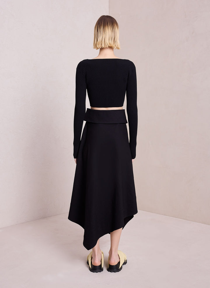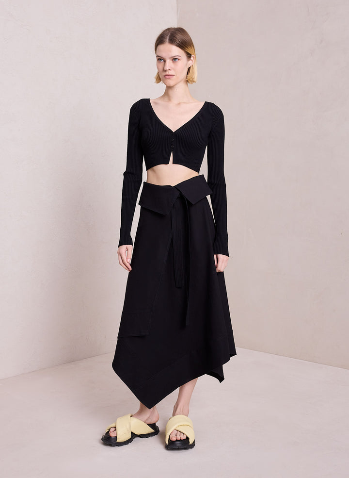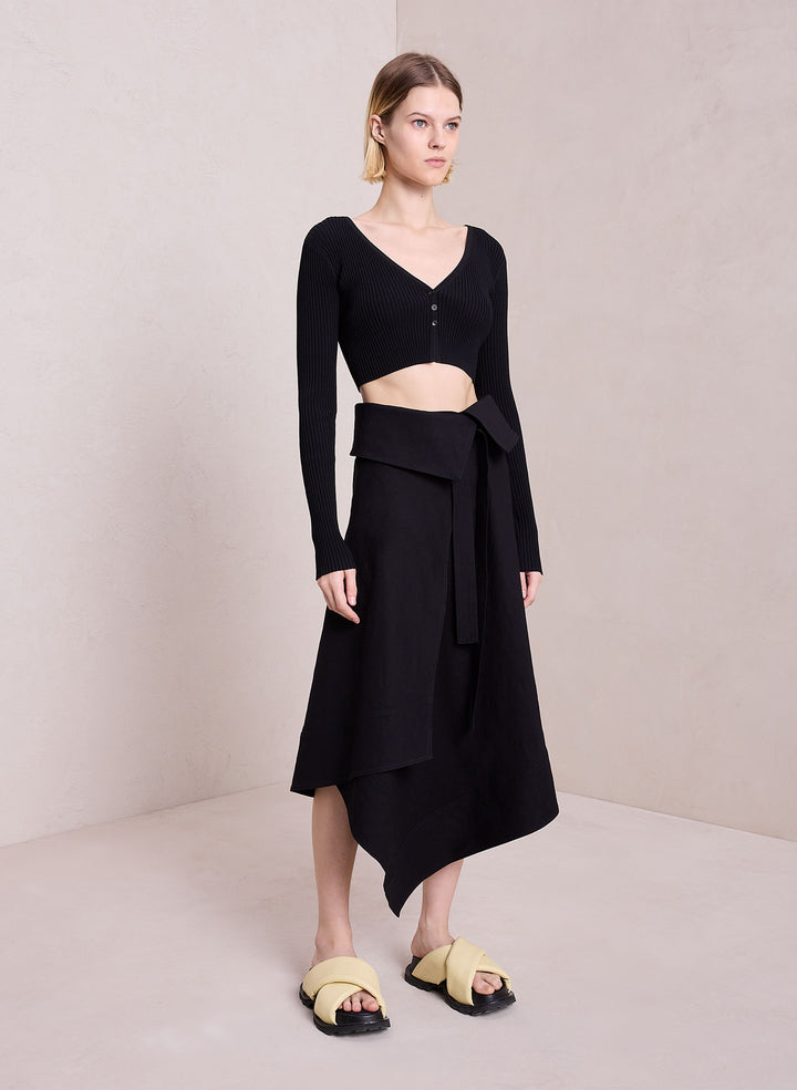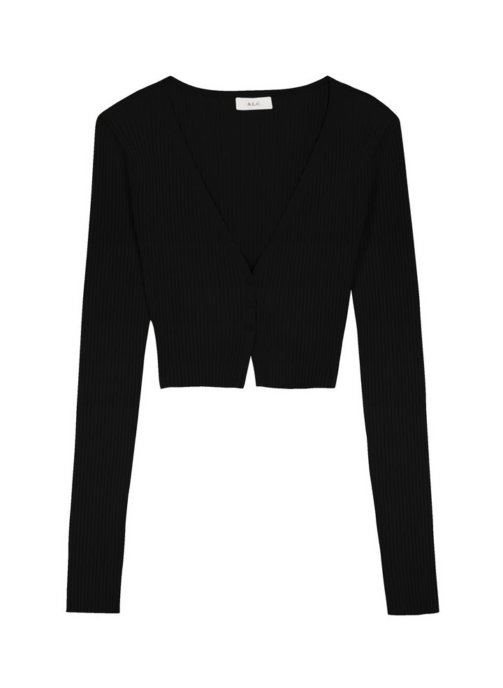 DescriptionThe Hallie Cardigan is knitted from a ribbed viscose blend in timeless black. This cropped silhouette features long sleeves and a V-neckline with three buttons that conceal a bra when secured. Shop Jackets