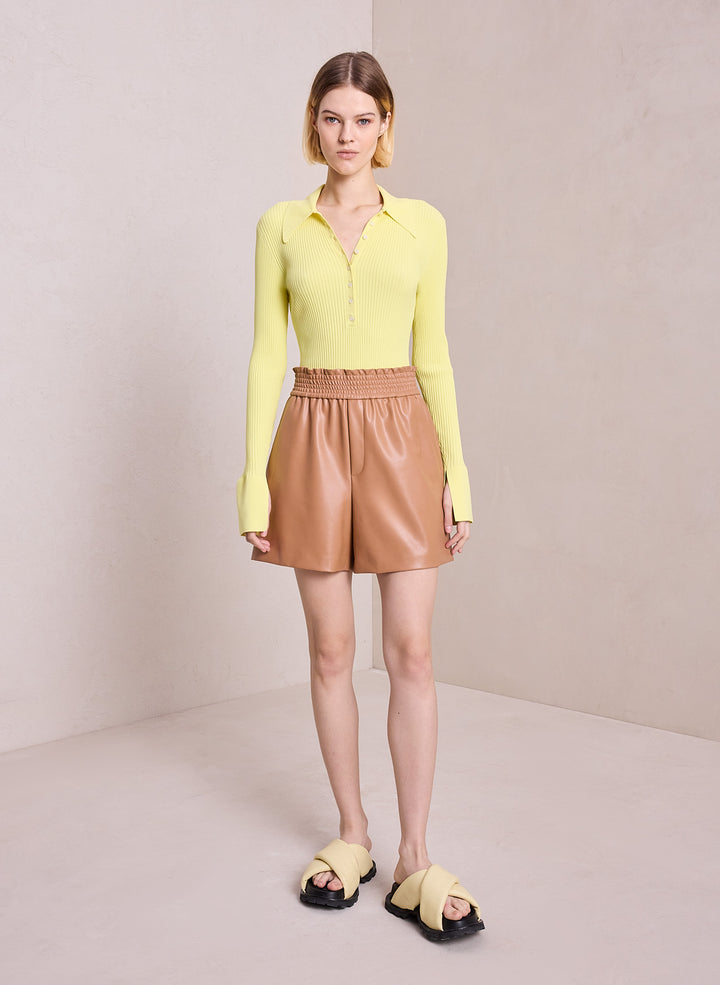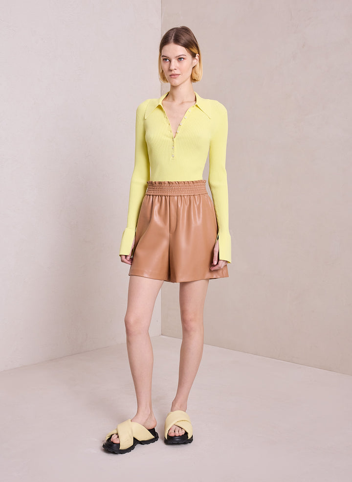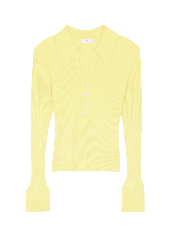 DescriptionThe Eleanor Sweater is knitted from a ribbed viscose blend in a citrine yellow hue. This fitted silhouette features a prominent point collar, button placket, and split bell sleeves. Shop Sweaters
