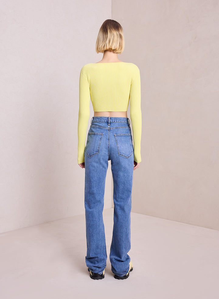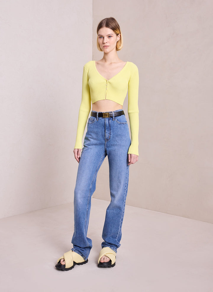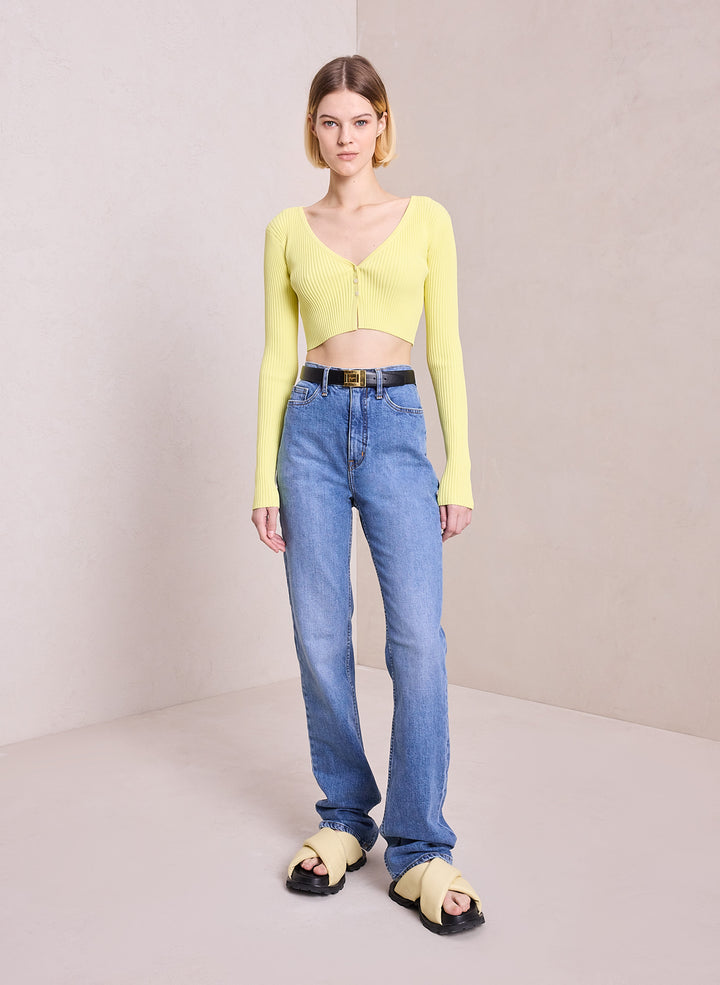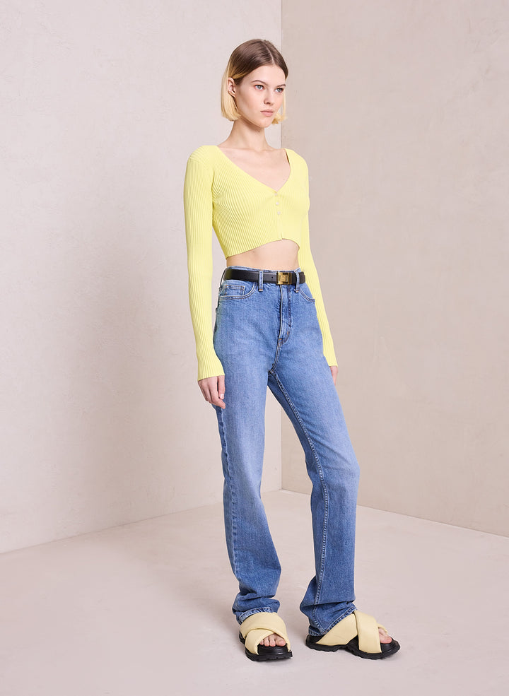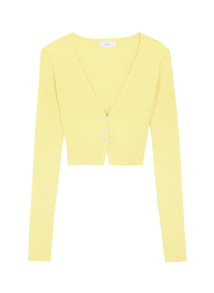 DescriptionThe Hallie Cardigan is knitted from a ribbed viscose blend in a citrine yellow hue. This cropped silhouette features long sleeves and a V-neckline with three buttons that conceal a bra when secured. Shop Tops