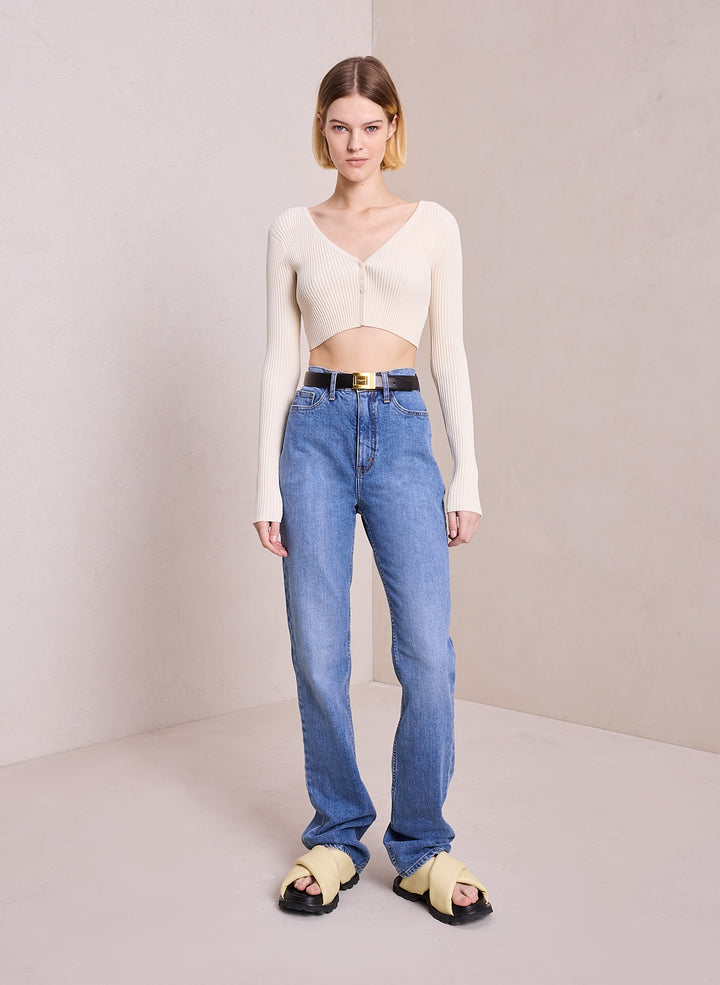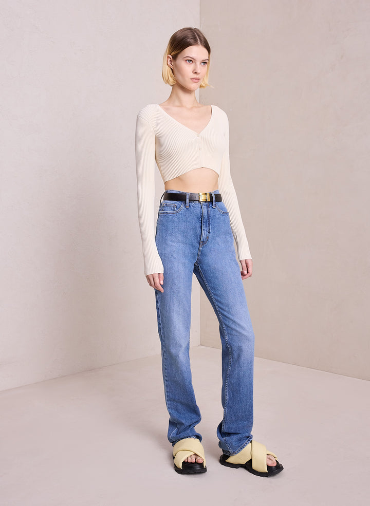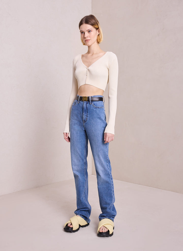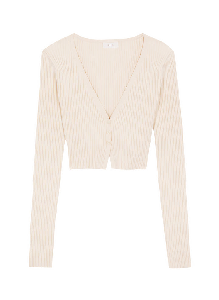 DescriptionThe Hallie Cardigan is knitted from a ribbed viscose blend in a creamy off-white hue. This cropped silhouette features long sleeves and a V-neckline with three buttons that conceal a bra when secured. Shop Tops