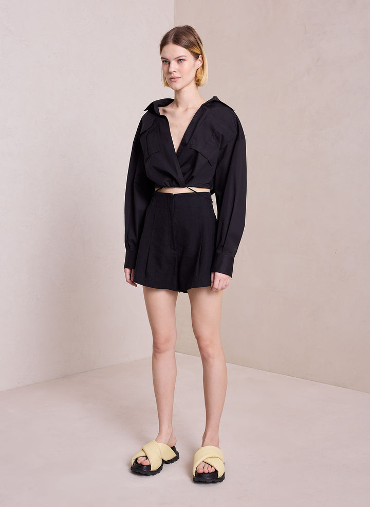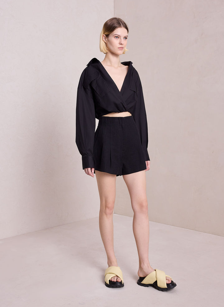 DescriptionThe Bennett Short is crafted from a lightweight linen cotton blend fabric in timeless black. This modern short features a bandless high-rise waist with pleating, bringing a relaxed touch to tailoring. Shop Bottoms