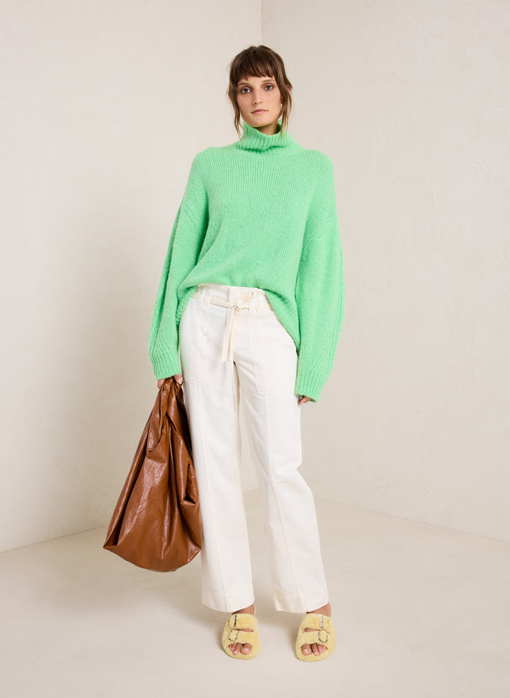?Styling Tip: ?Enliven the neutral tone with a bright sweater and sandals.